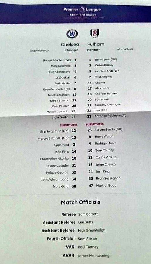 1 Robert Sanchez, 3 Marc Cucurella (40 Renato Veiga 82), 6 Levi Colwill, 8 Enzo Fernandez, 10 Mykhailo Mudryk ( 7 Pedro Neto 46), 11 Noni Madueke, 15 Nicolas Jackson (14 Joao Felix 68), 20 Cole Palmer (18 Chris Nkunku 82), 25 Moises Caicedo (22 Kiernan Dewsbury-Hall 76), 27 Malo Gusto, 29 Wesley Fofana |