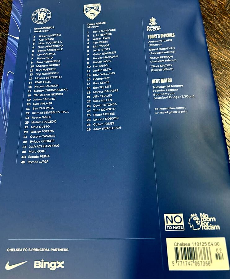 1 Robert Sanchez, 3 Marc Cucurella, 6 Levi Colwill, 7 Pedro Neto, 8 Enzo Fernandez (11 Noni Madueke 82), 9 Liam Delap (15 Nicolas Jackson 64), 10 Cole Palmer (38 Marc Guiu 82), 23 Trevoh Chalobah, 24 Reece James (45 Romeo Lavia 64), 25 Moises Caicedo, 27 Malo Gusto |