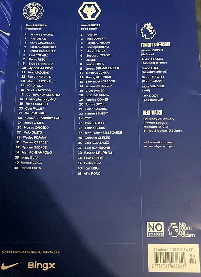 1 Robert Sanchez, 3 Marc Cucurella, 6 Levi Colwill, 7 Pedro Neto (18 Chris Nkunku 78), 8 Enzo Fernandez (17 Andrey Santos 61), 10 Cole Palmer, 23 Trevoh Chalobah, 24 Reece James (22 Kiernan Dewsbury-Hall 77), 25 Moises Caicedo, 27 Malo Gusto, 20 Joao Pedro ( 9 Liam Delap 67) |