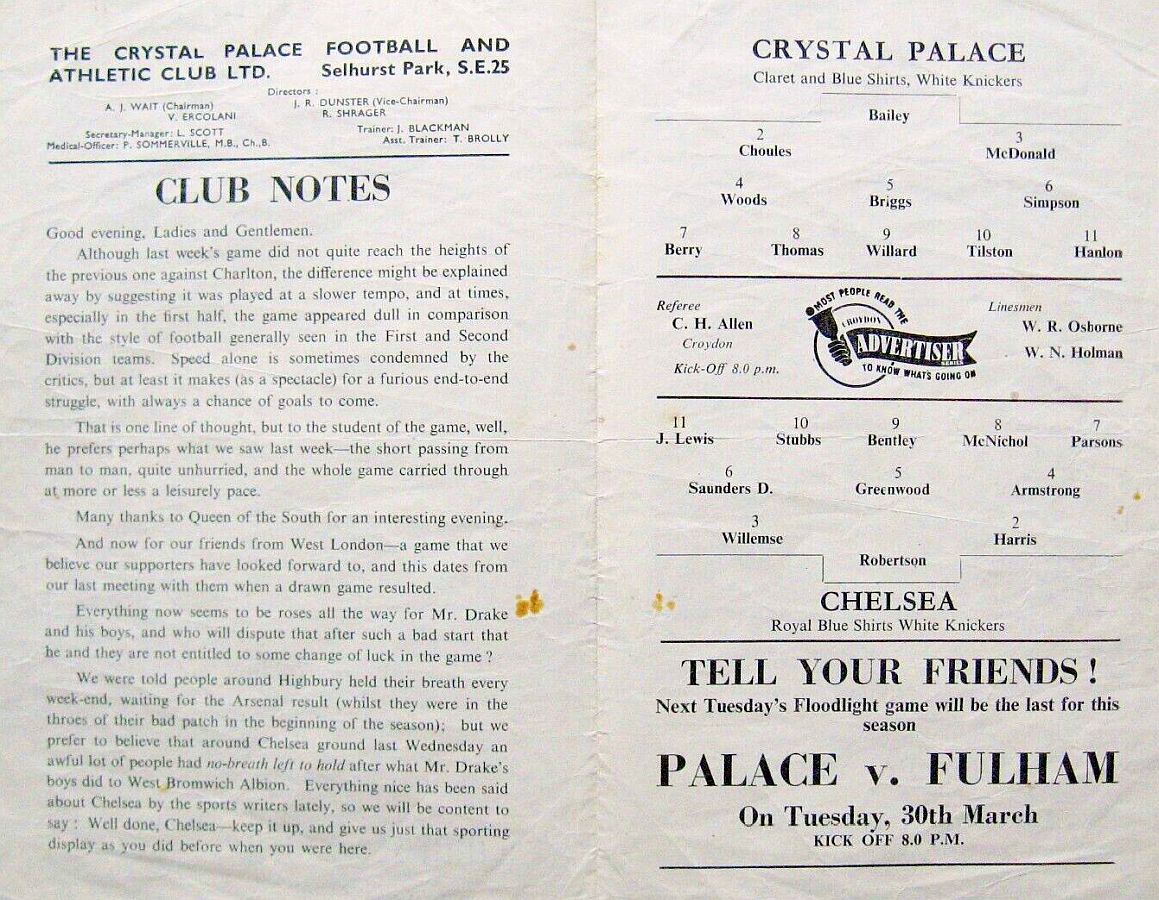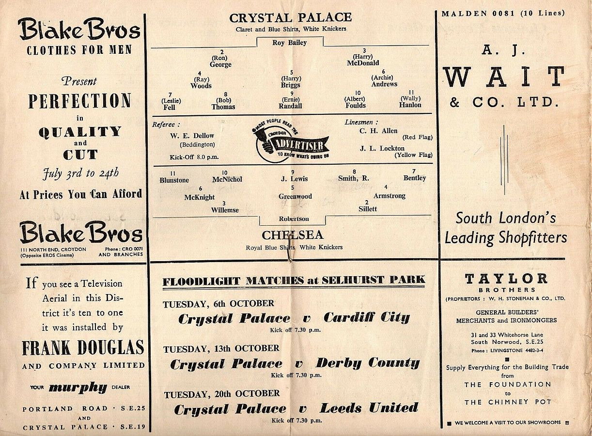 Reg Matthews, Ken Shellito, John Sillett, Terry Venables, Mel Scott, Sylvan Anderton, Peter Brabrook, Johnny Brooks, Charlie Livesey, Tony Nicholas, Frank Blunstone |