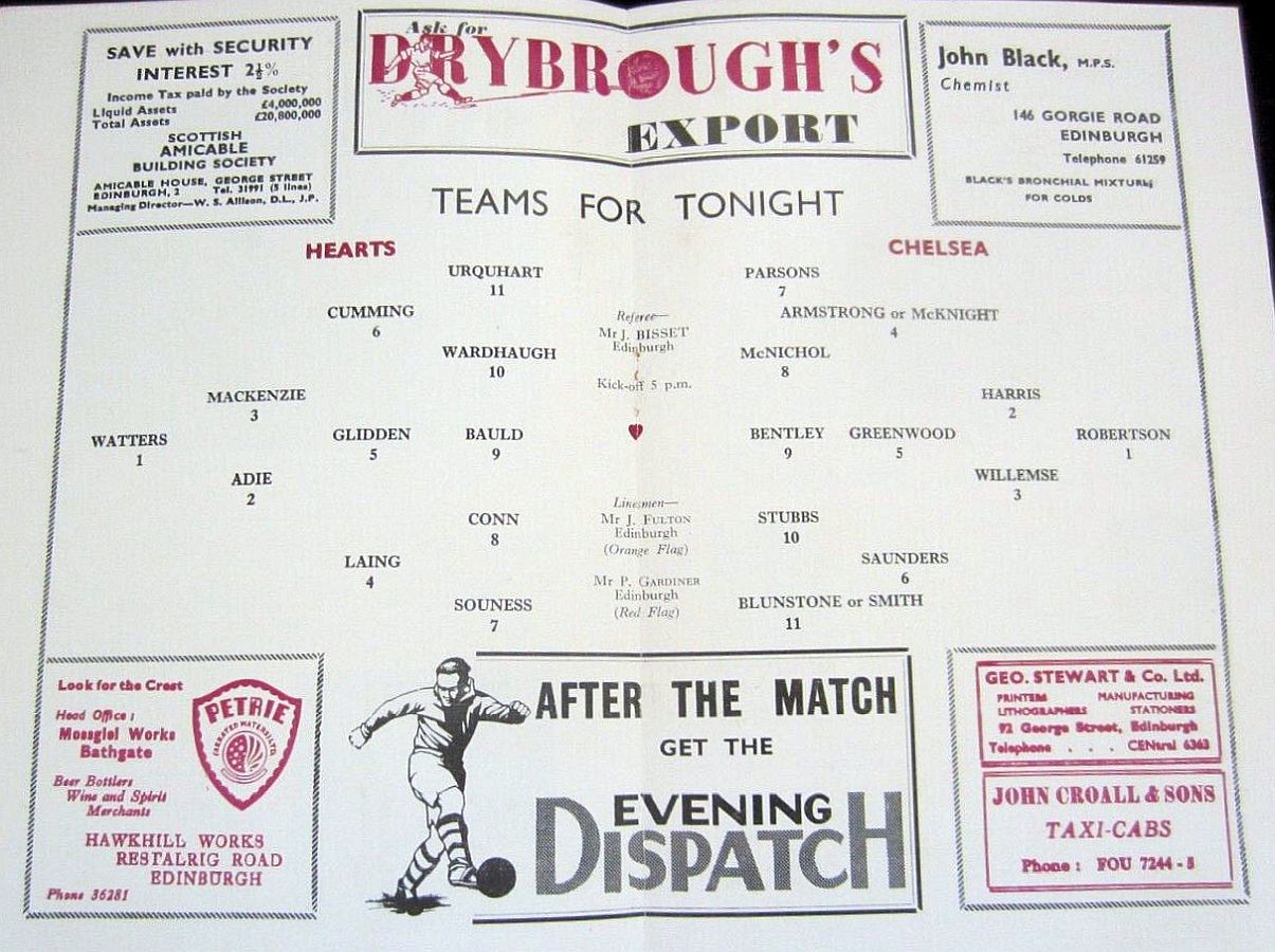 Cruickshank (Hearts), Grant (Hibs), Thomson (Hearts), Baxter (Hibs), Cumming (Hearts), Higgins (Hearts), Smith (Hearts), Johnstone (Hibs), Baker (Hibs), Young (Hearts), Ormond (Hibs) |