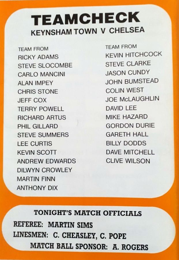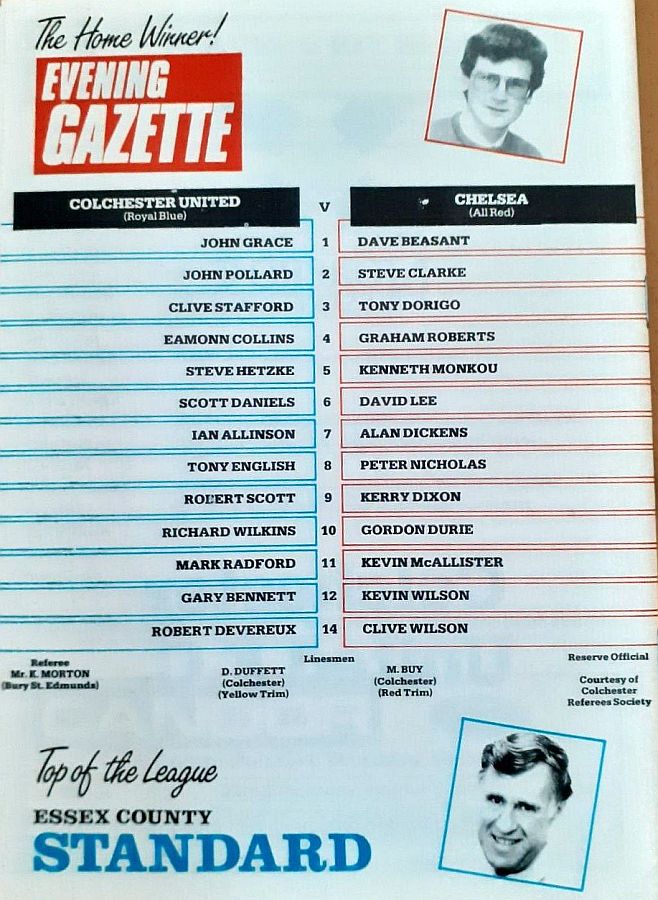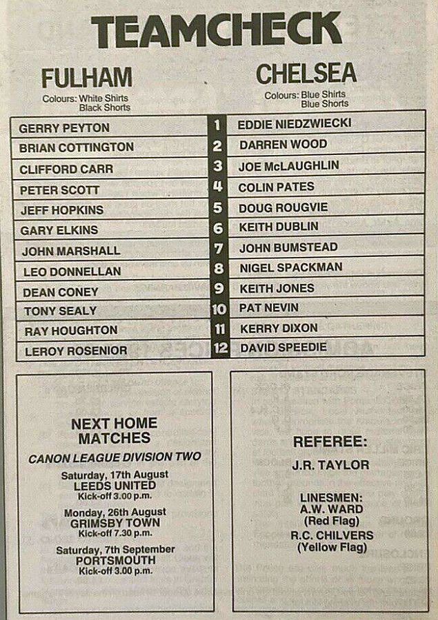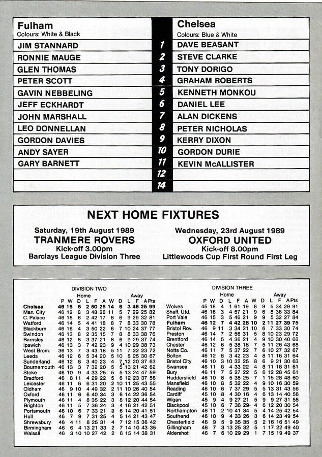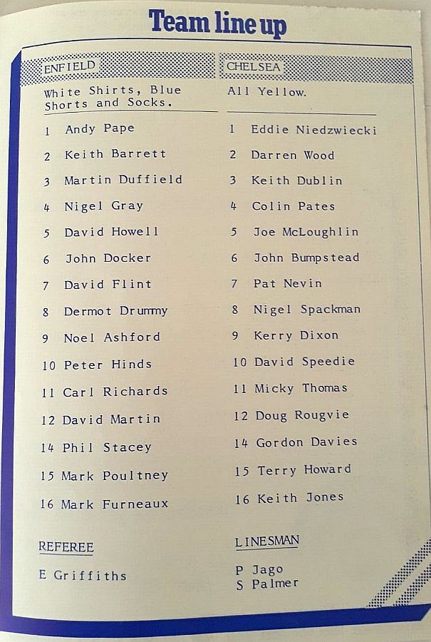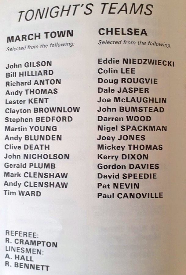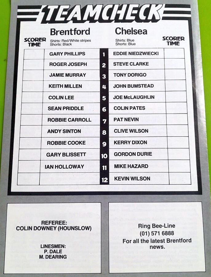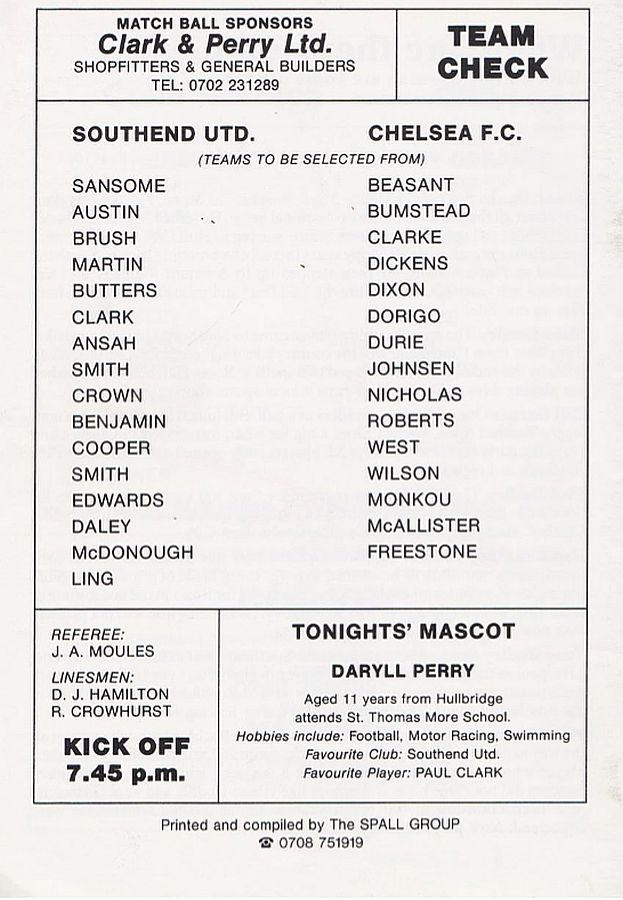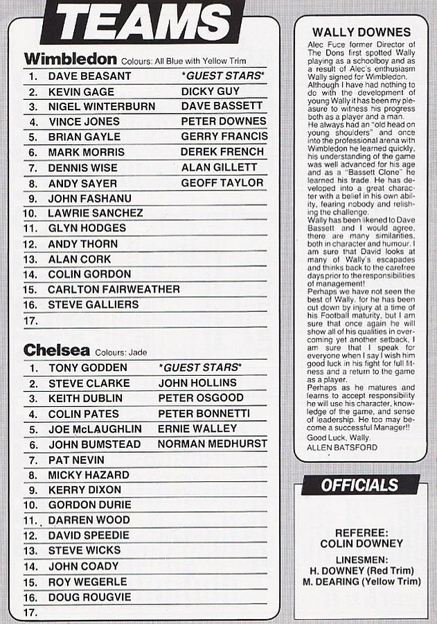 Dave Beasant, Gareth Hall (Steve Clarke), Tony Dorigo, David Lee, Erland Johnsen (Ken Monkou), Andy Townsend (Alan Dickens), Dennis Wise, Peter Nicholas (John Bumstead), Kerry Dixon (Kevin McAllister), Kevin Wilson (Gareth Hall), Kevin McAllister (Graeme Le Saux) |
