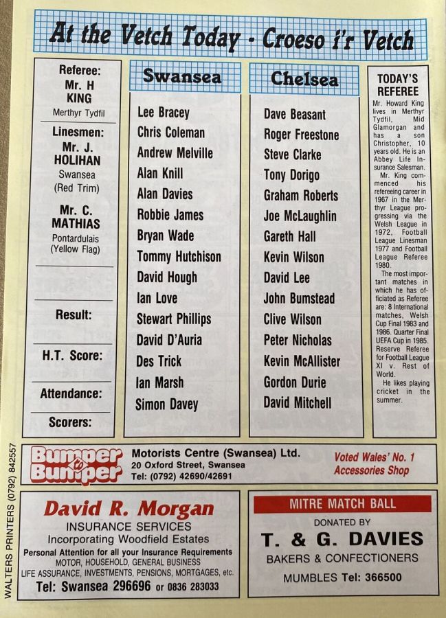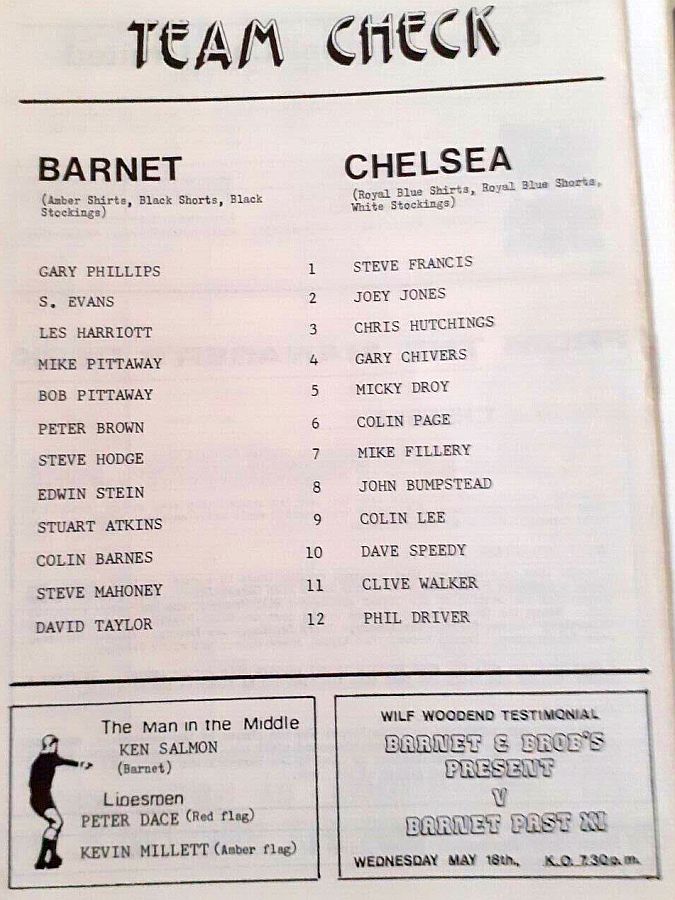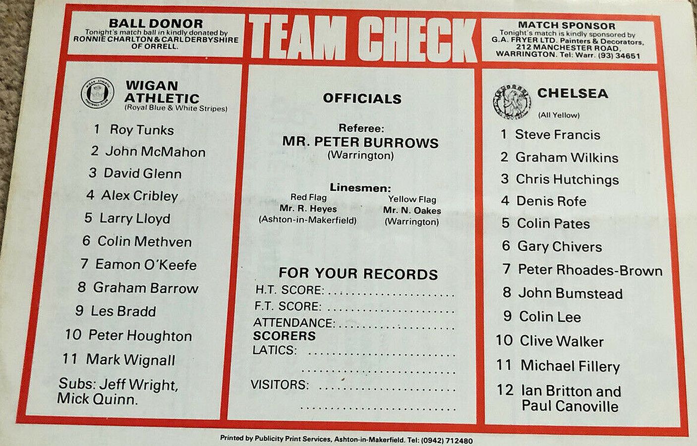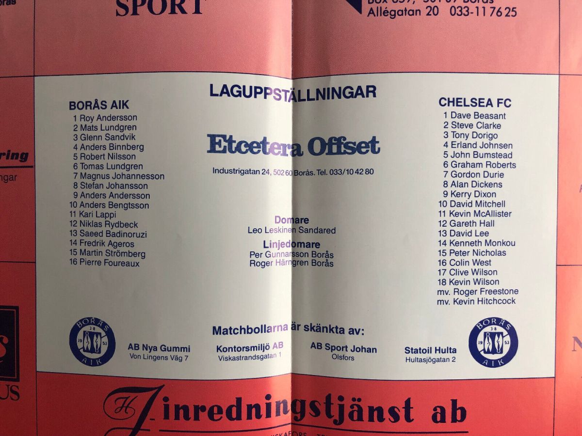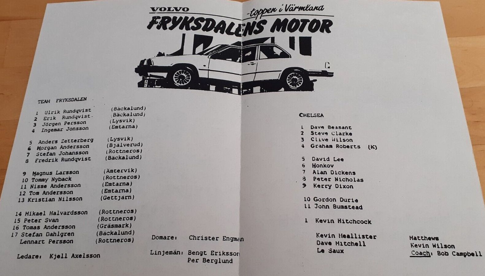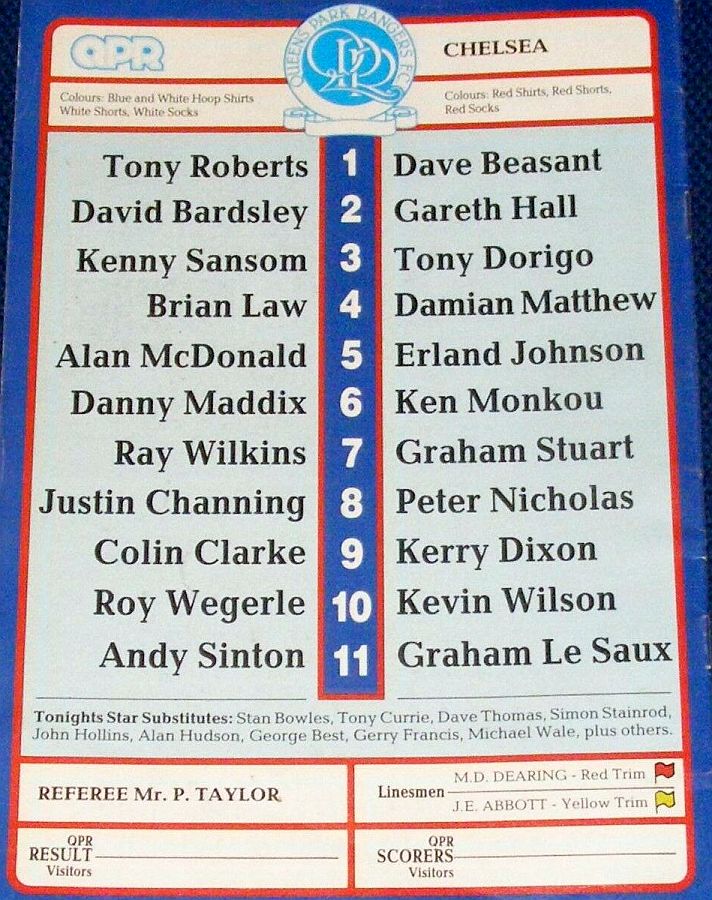 Dave Beasant, Gareth Hall (Steve Clarke), Tony Dorigo, David Lee, Erland Johnsen (Ken Monkou), Andy Townsend (Alan Dickens), Dennis Wise, Peter Nicholas (John Bumstead), Kerry Dixon (Kevin McAllister), Kevin Wilson (Gareth Hall), Kevin McAllister (Graeme Le Saux) |