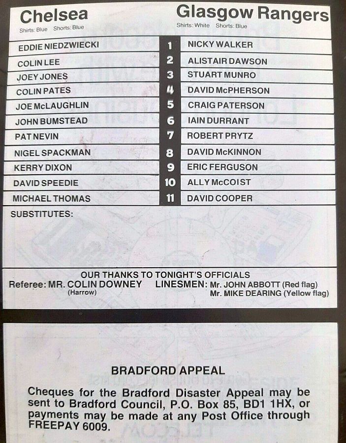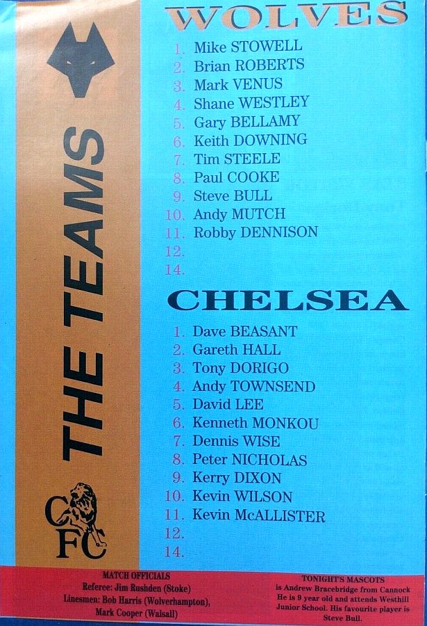 Dave Beasant (Kevin Hitchcock 46), Steve Clarke, Frank Sinclair (Jason Cundy 46), Graham Roberts (Erland Johnsen 46), Gareth Hall (Frank Sinclair 82), Ken Monkou, Dennis Wise (Dave Beasant 74), John Bumstead (Craig Burley 46), Kerry Dixon, Kevin McAllister (Graham Stuart 46), Graeme Le Saux (Darren Barnard 46) |