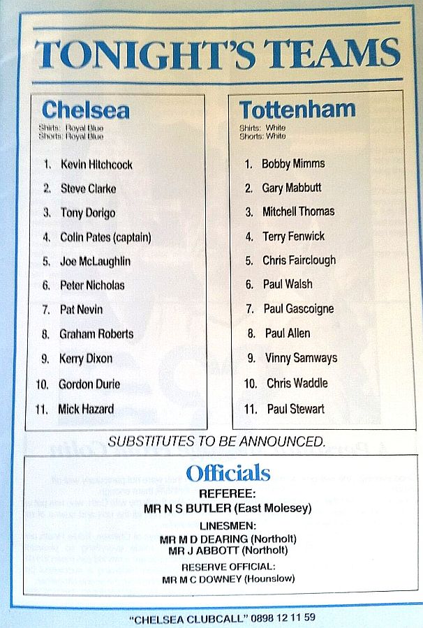 Dave Beasant, Gareth Hall, Tony Dorigo, Andy Townsend, Erland Johnsen, Ken Monkou, Dennis Wise, Peter Nicholas, Kerry Dixon, Gordon Durie (Graeme Le Saux 7), Kevin Wilson |