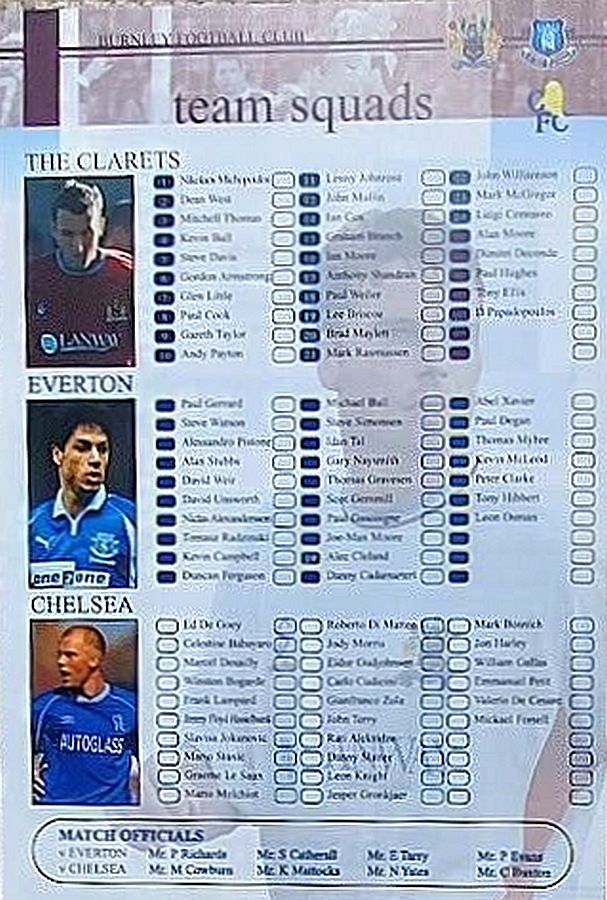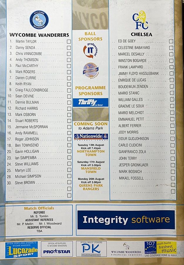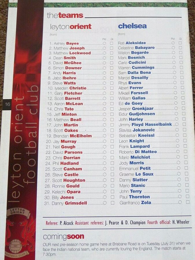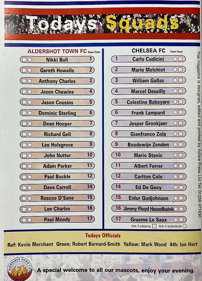 Mark Bosnich, Albert Ferrer (Joel Kitamarike 46), Mario Melchiot, Robert Huth (Winston Bogarde 46), Graeme Le Saux (Warren Cummings 46), Bolo Zenden, Frank Lampard, Joe Keenan, Robert Wolleaston (Valerio Di Cesare 46), Gianfranco Zola, Felipe Oliveira |