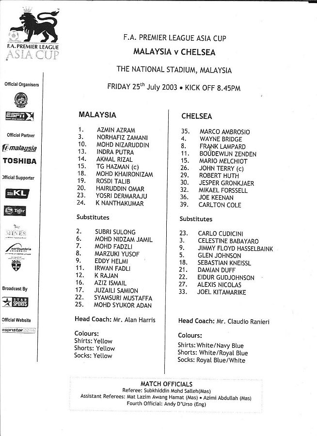 Carlo Cudicini (Ed De Goey 60), Albert Ferrer, William Gallas, Robert Huth, Warren Cummings, Robert Wolleaston, Enrique De Lucas, Joe Keenan, Bolo Zenden (Joel Kitamarike 46), Gianfranco Zola, Filipe Oliviera |