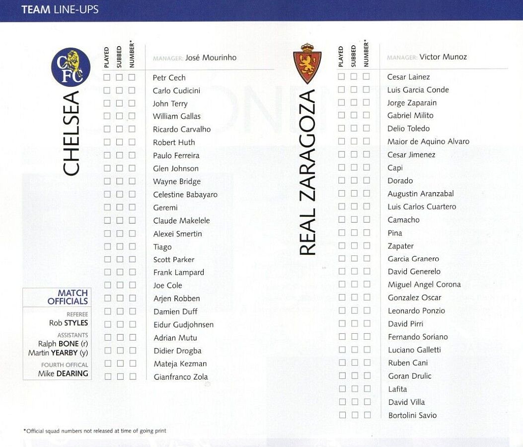 Ed De Goey (Mark Bosnich 46), William Gallas, Marcel Desailly (Winston Bogarde, 66), Celestine Babayaro (Jon Harley 46), Mario Melchiot, Frank Lampard, Jody Morris (Slavisa Jokanovic 46), Graeme Le Saux, Gianfranco Zola (Eidur Gudjohnsen 46), Jimmy Floyd Hasselbaink (Mikael Forssell 65), Jesper Gronkjaer (Mario Stanic 46) |