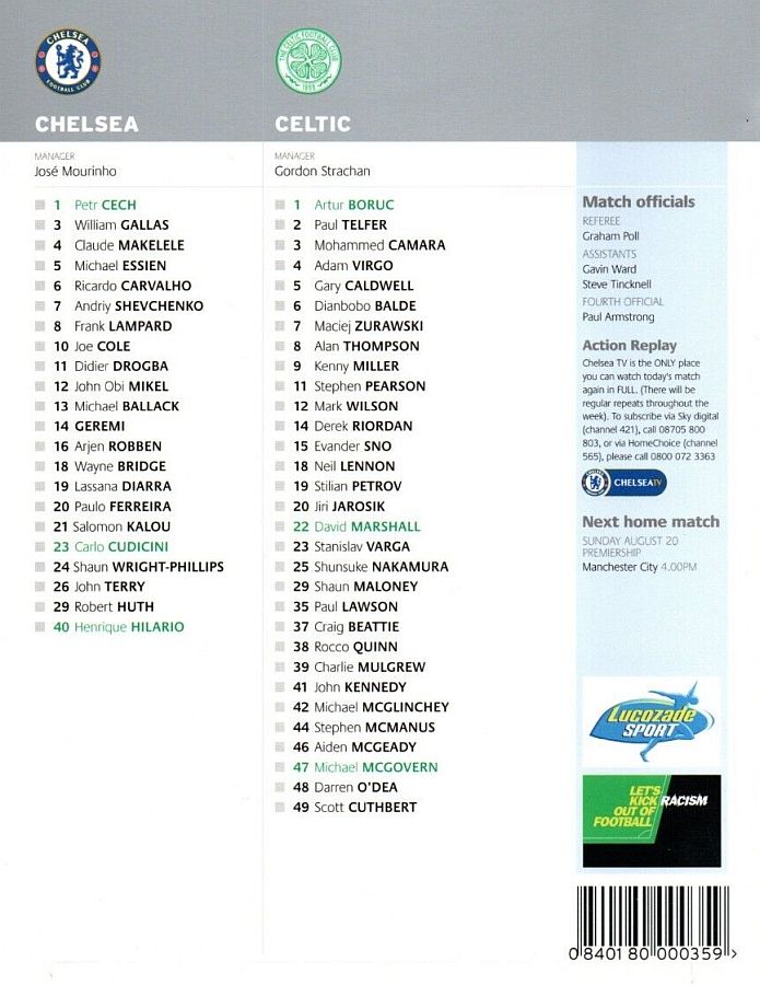 Petr Cech, Paulo Ferreira, Ricardo Carvalho, John Terry, Ashley Cole (Wayne Bridge 64), Deco, Mikel Obi (Shaun Wright-Phillips 46), Frank Lampard, Michael Essien, Nicolas Anelka (Andriy Shevchenko 74), Joe Cole (Florent Malouda 46) |