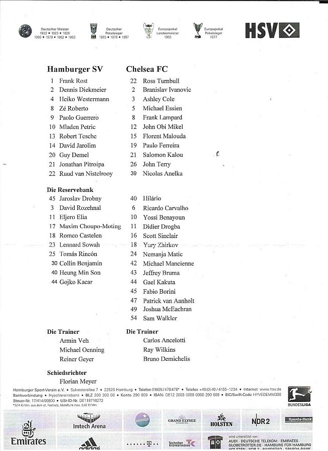Petr Cech (Carlo Cudicini 72), Branislav Ivanovic (Paulo Ferreira 61), Alex, John Terry (Ricardo Carvalho 61), Ashley Cole, Michael Ballack Deco 46), Mikel Obi, Frank Lampard, Shaun Wright-Phillips (Scott Sinclair 77), Nicolas Anelka (Andriy Shevchenko 66), Florent Malouda |