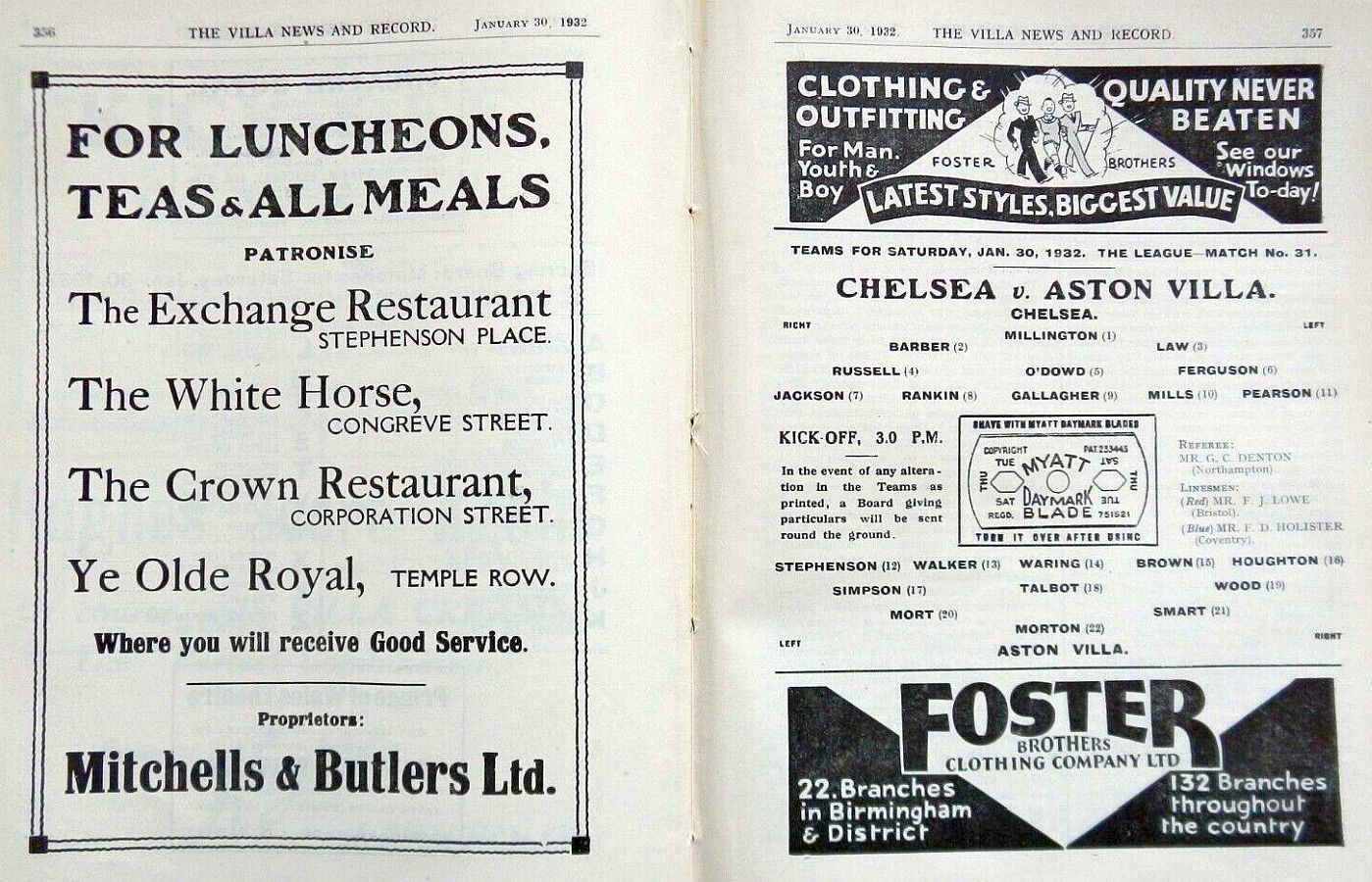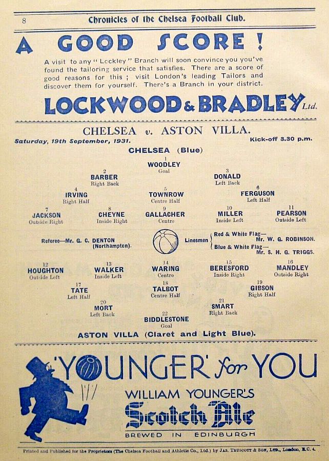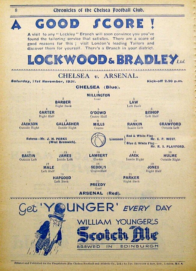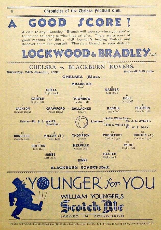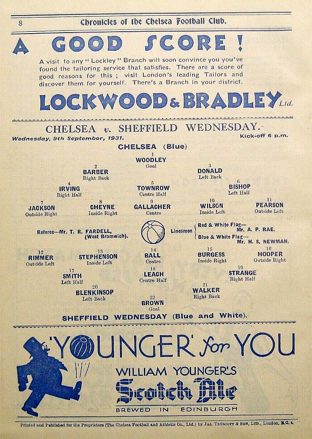 1 Vic Woodley, 2 George Barber, 3 Tommy Law, 4 William Russell, 5 Peter O'Dowd, 6 Willie Ferguson, 7 John Rankin, 8 Harold Miller, 9 Hughie Gallacher, 10 Wilf Chitty, 11 George Pearson |