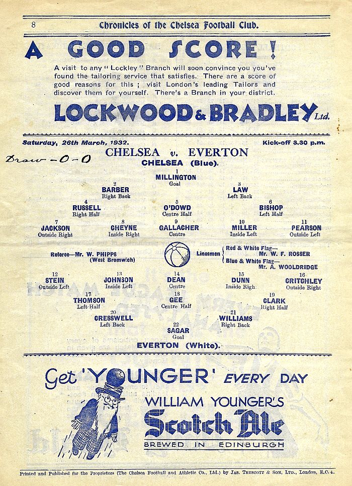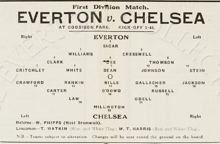 Ted Sagar, Ben Williams, Warney Cresswell, Archie Clark, Charlie Gee, Jock Thomson, Ted Critchley, Jimmy Dunn, Dixie Dean, Tommy Johnson, Jimmy Stein |
