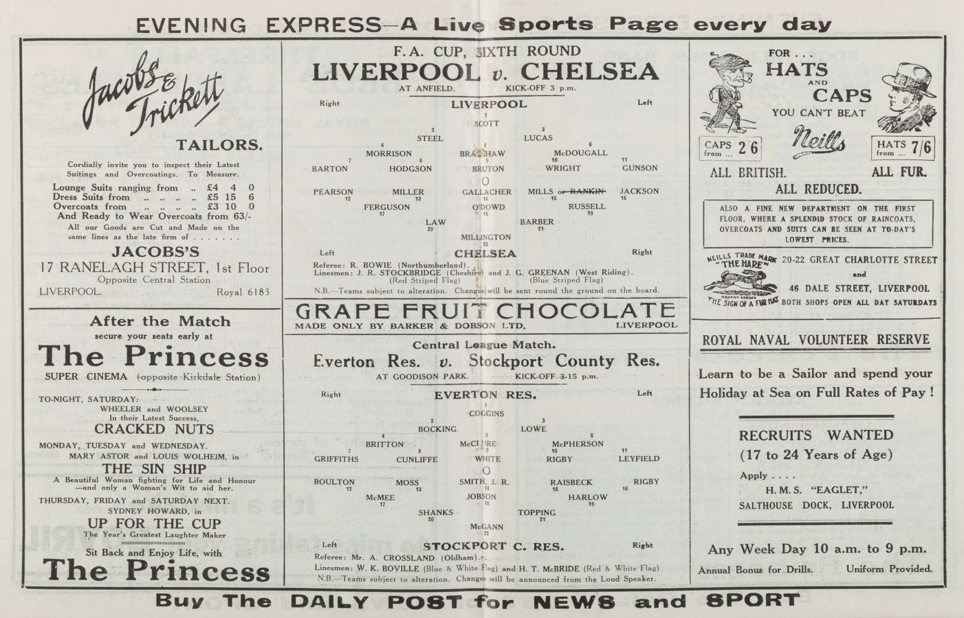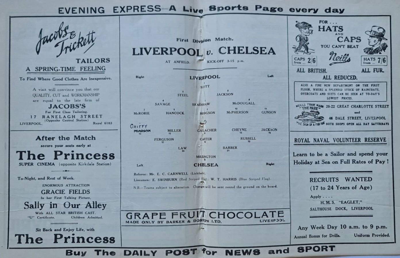 Elisha Scott, Willie Steel, Jimmy Jackson, Ted Savage, Tom Bradshaw, Jimmy McDougall, Danny McRorie, Gordon Hodgson, Ted Hancock, Archie McPherson, Gordon Gunson |