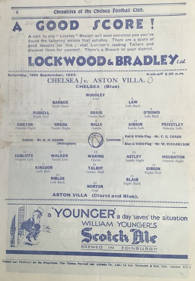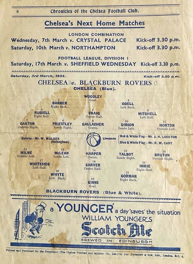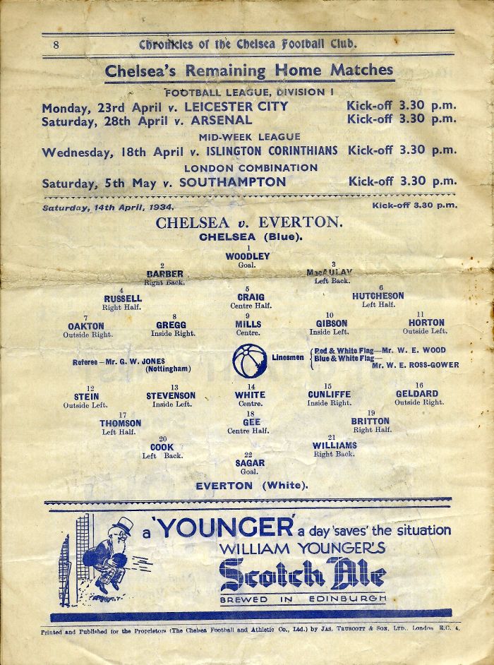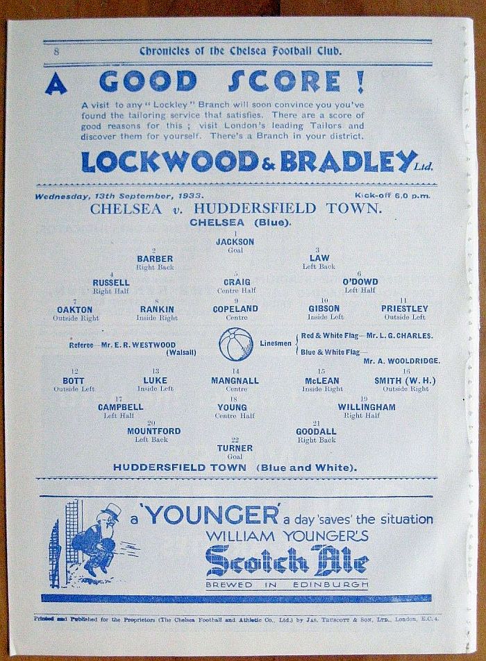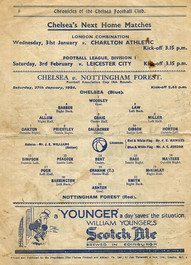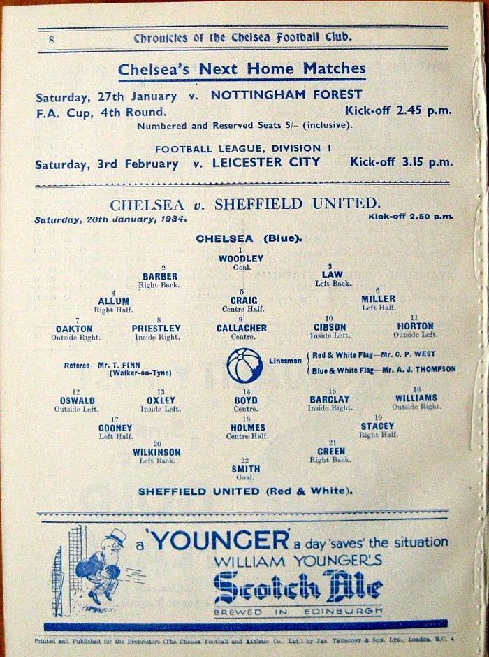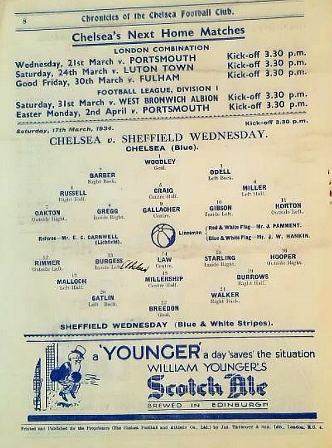 1 Vic Woodley, 2 George Barber, 3 Leslie Odell, 4 William Russell, 5 Allan Craig, 6 Billy Mitchell, 7 Eric Oakton, 8 Tom Priestley, 9 Hughie Gallacher, 10 George Gibson, 11 Jack Horton |