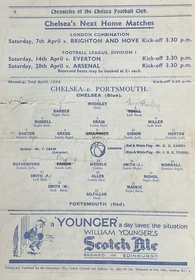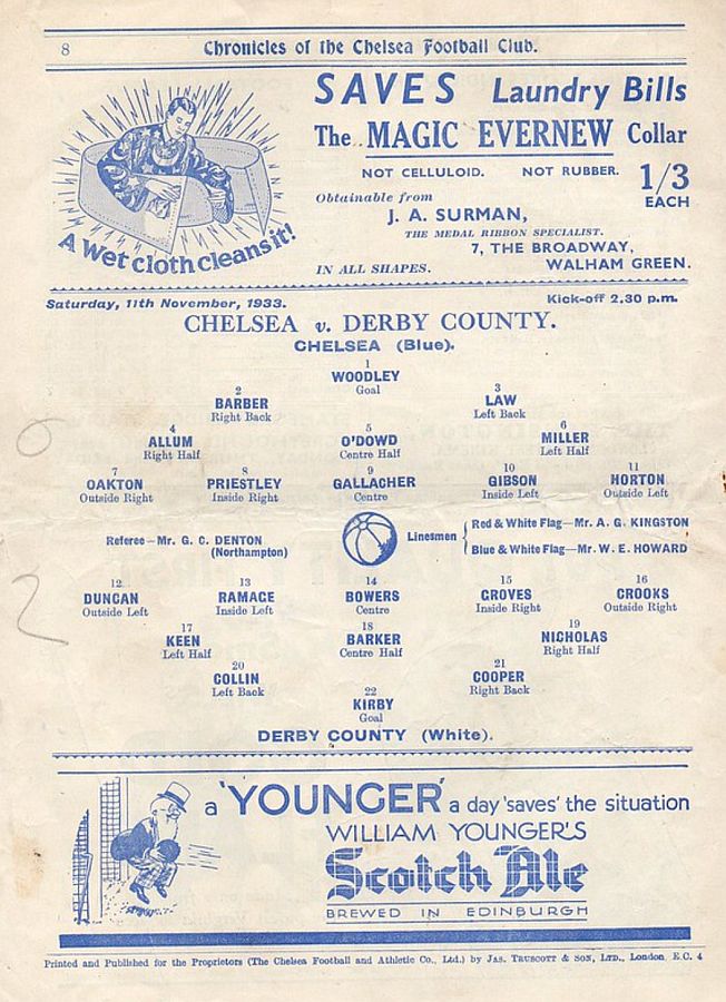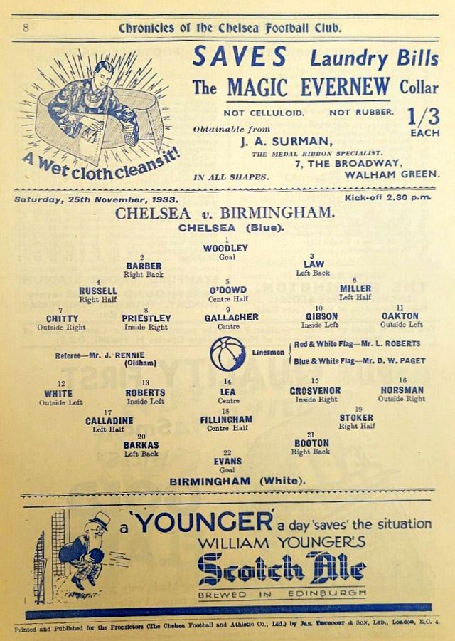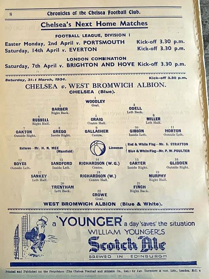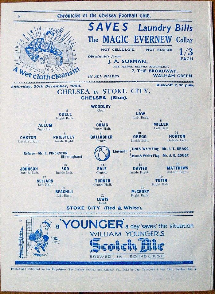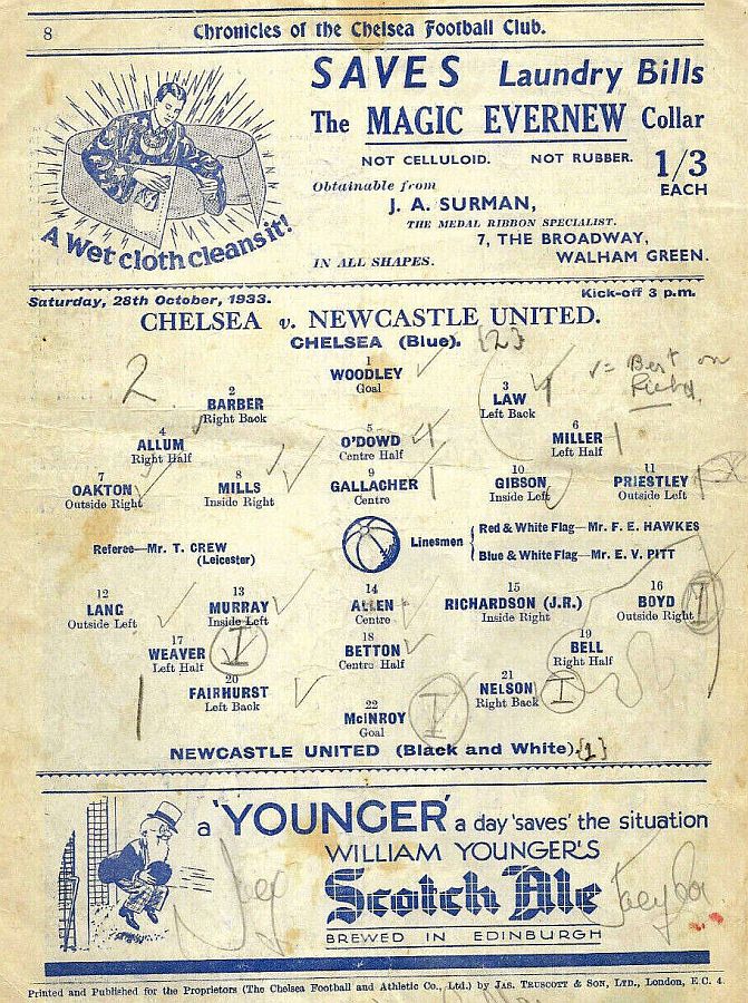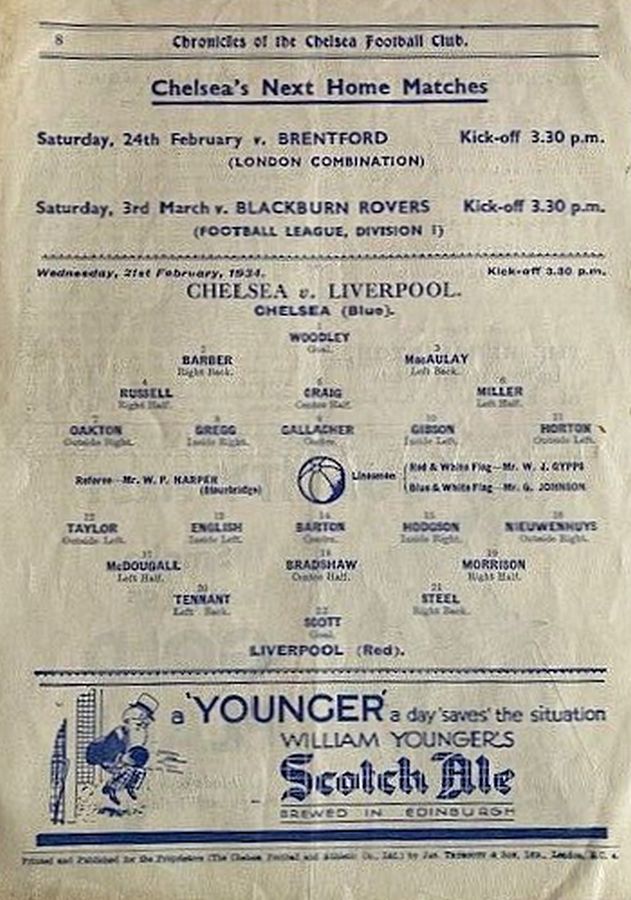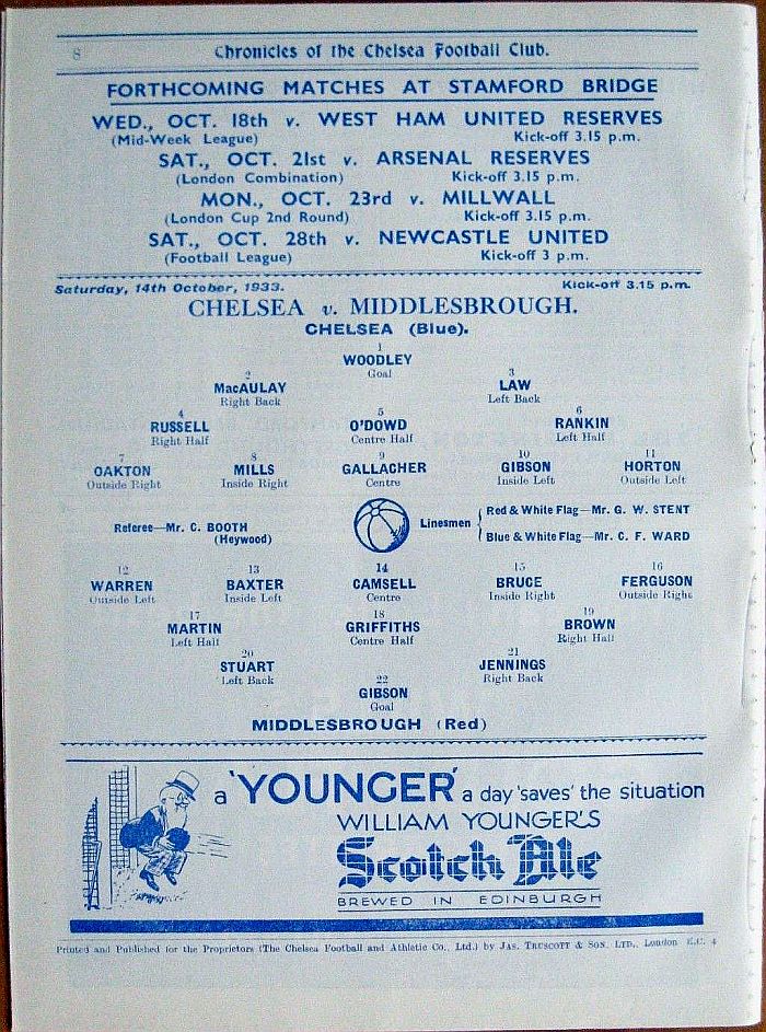 1 Vic Woodley, 2 George Barber, 3 Leslie Odell, 4 William Russell, 5 Allan Craig, 6 Harold Miller, 7 Eric Oakton, 8 Bobby Gregg, 9 Hughie Gallacher, 10 George Gibson, 11 Jack Horton |
