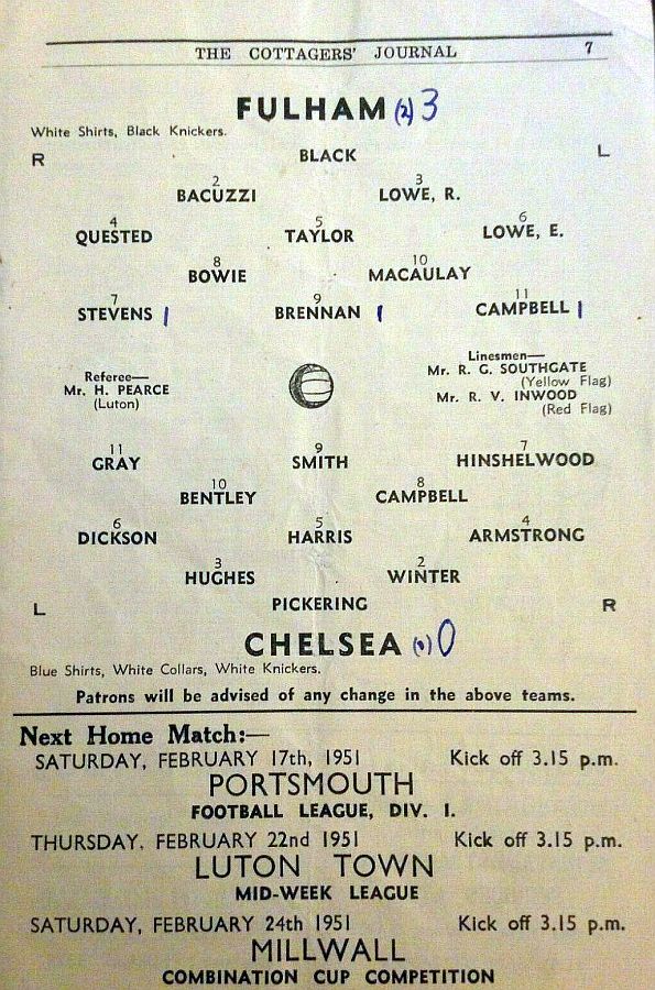 1 Harry Medhurst, 2 Sid Bathgate, 3 Sid Tickridge, 4 John Harris, 5 Jack Saunders, 6 Reg Williams, 7 Bobby Campbell, 8 Roy Bentley, 9 Bobby Smith, 10 Ken Armstrong, 11 Billy Gray |