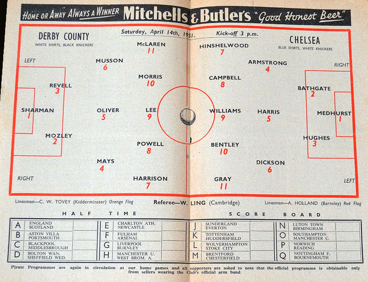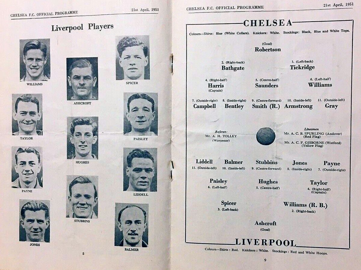 1 Harry Medhurst, 2 Sid Tickridge, 3 Billy Hughes, 4 Ken Armstrong, 5 John Harris, 6 Bill Dickson, 7 Wally Hinshelwood, 8 Bobby Campbell, 9 Reg Williams, 10 Roy Bentley, 11 Billy Gray |
