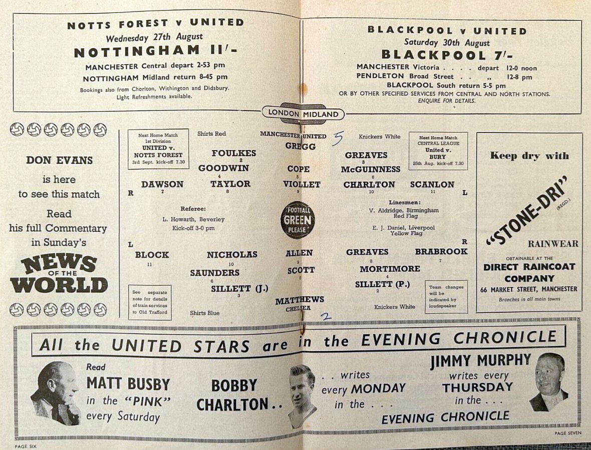 Harry Gregg, Bill Foulkes, Ian Greaves, Freddie Goodwin, Ronnie Cope, Wilf McGuinness, Alex Dawson, Ernie Taylor, Dennis Viollet, Bobby Charlton, Albert Scanlon |