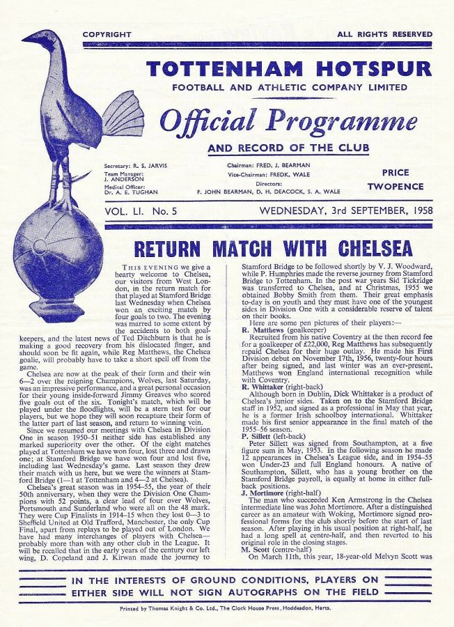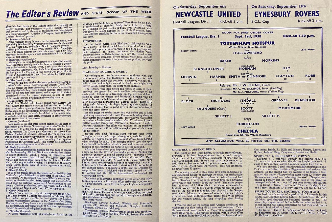 John Hollowbread, Peter Baker, Mel Hopkins, Danny Blanchflower, Maurice Norman, Jim Iley, Terry Medwin, Tommy Harmer, Bobby Smith, Eddie Clayton, George Robb |