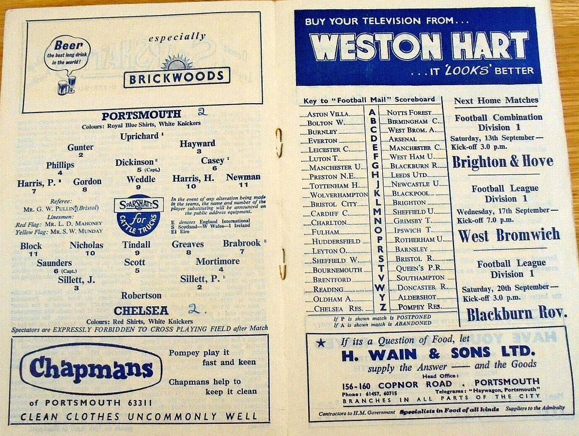 1 Reg Matthews, 2 Peter Sillett, 3 John Sillett, 4 John Mortimore, 5 Mel Scott, 6 Derek Saunders, 7 Peter Brabrook, 8 Jimmy Greaves, 9 Les Allen, 10 Tony Nicholas, 11 Michael Block |