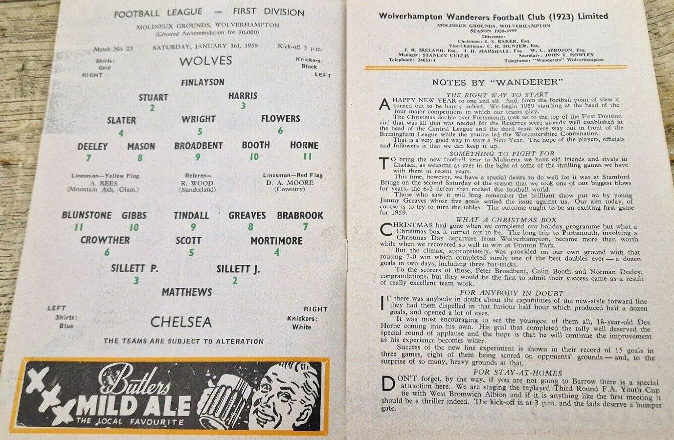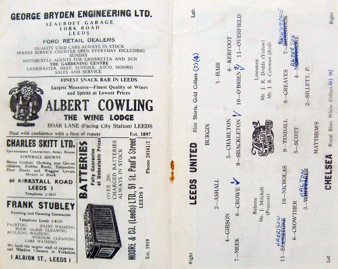 1 Reg Matthews, 2 Peter Sillett, 3 Richard Whittaker, 4 Sylvan Anderton, 5 John Mortimore, 6 Stan Crowther, 7 Peter Brabrook, 8 Jimmy Greaves, 9 Les Allen, 10 Frank Blunstone, 11 Mike Harrison |