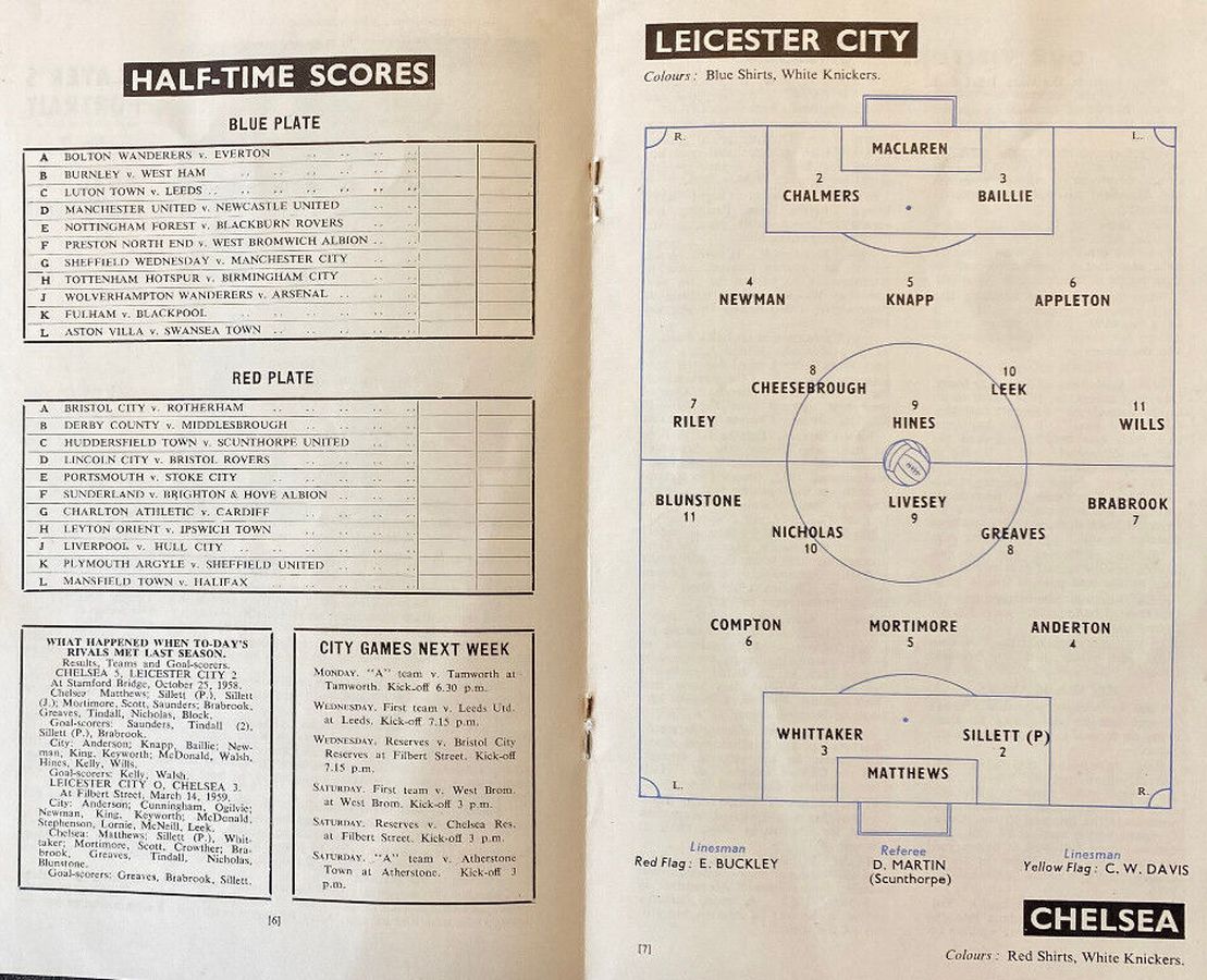 1 Reg Matthews, 2 Peter Sillett, 3 Richard Whittaker, 4 Sylvan Anderton, 5 Mel Scott, 6 John Compton, 7 Peter Brabrook, 8 Jimmy Greaves, 9 Charlie Livesey, 10 Tony Nicholas, 11 Frank Blunstone |