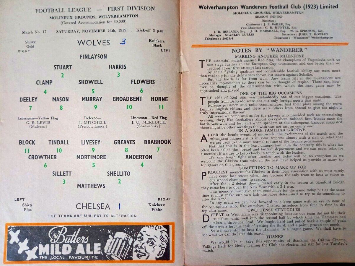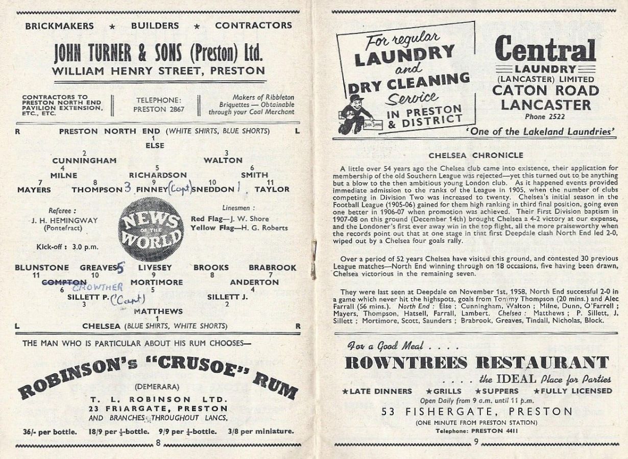1 Reg Matthews, 2 John Sillett, 3 Ron Tindall, 4 Sylvan Anderton, 5 Mel Scott, 6 Stan Crowther, 7 Peter Brabrook, 8 Jimmy Greaves, 9 Charlie Livesey, 10 Tony Nicholas, 11 Frank Blunstone |