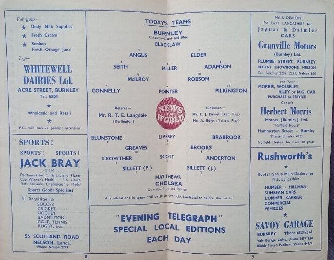 Adam Blacklaw, John Angus, Tommy Cummings, Bobby Seith, Brian Miller, Jimmy Adamson, John Connelly, Jimmy McIlroy, Ray Pointer, Jimmy Robson, Brian Pilkington |