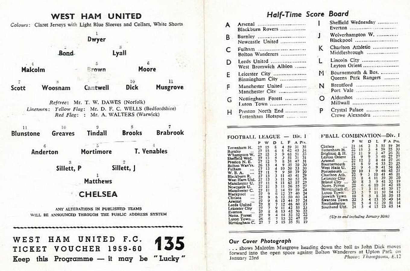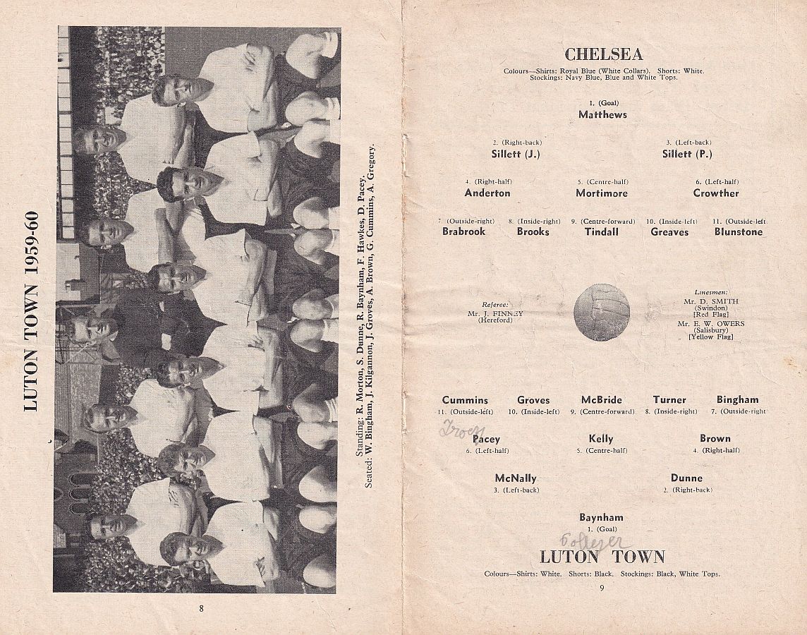 1 Reg Matthews, 2 John Sillett, 3 Peter Sillett, 4 Sylvan Anderton, 5 John Mortimore, 6 Stan Crowther, 7 Peter Brabrook, 8 Johnny Brooks, 9 Ron Tindall, 10 Jimmy Greaves, 11 Frank Blunstone |