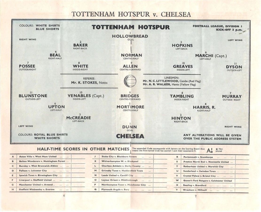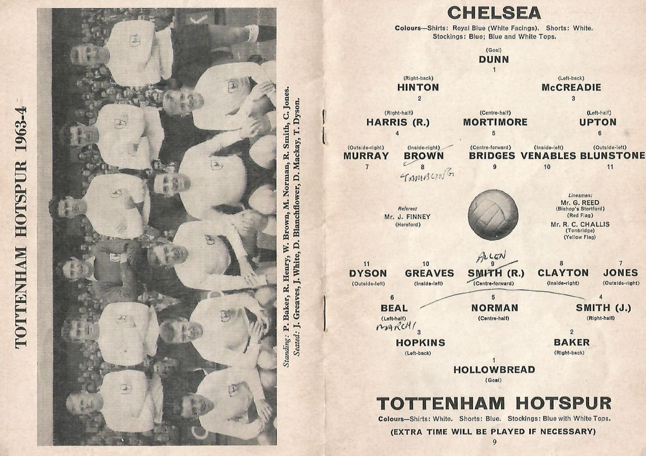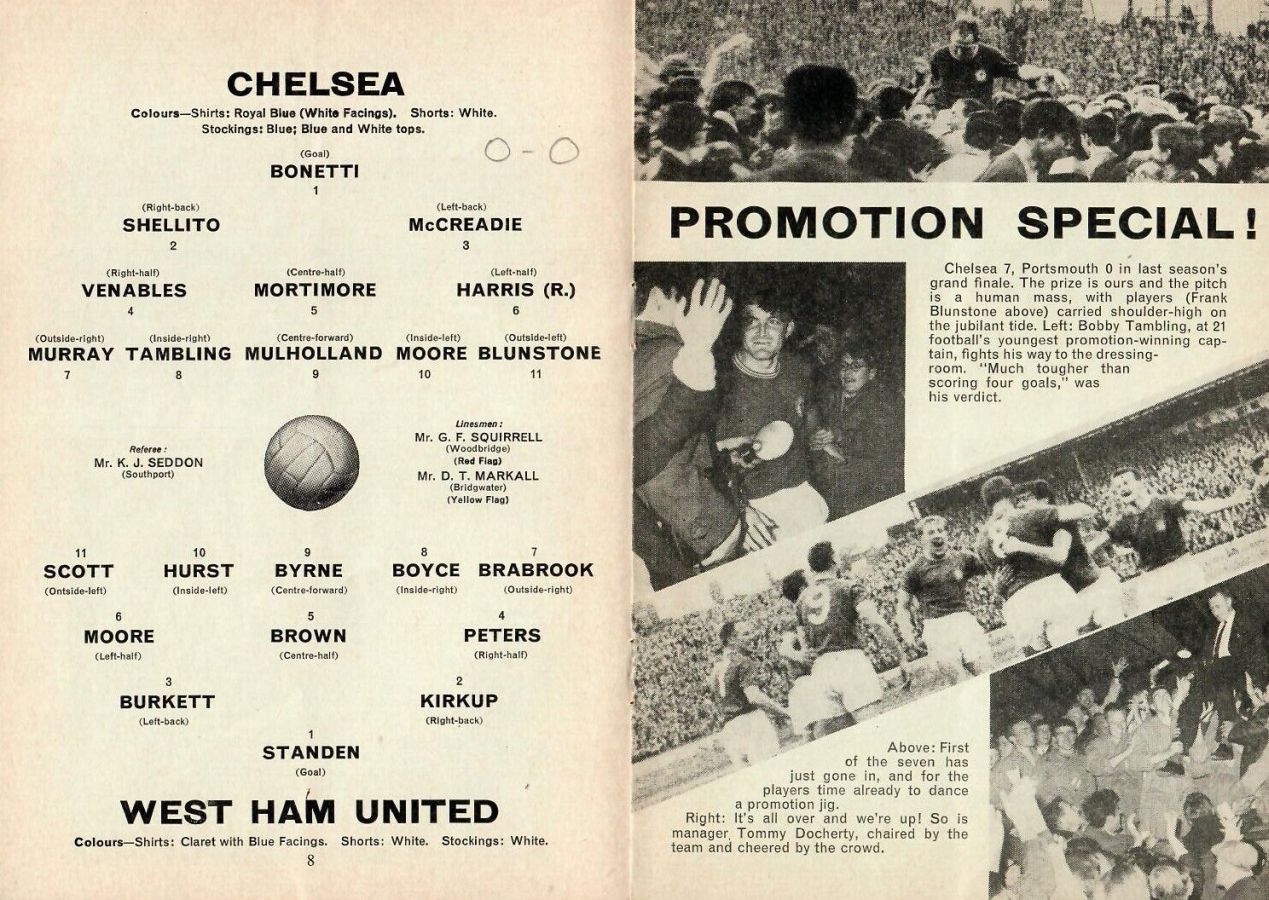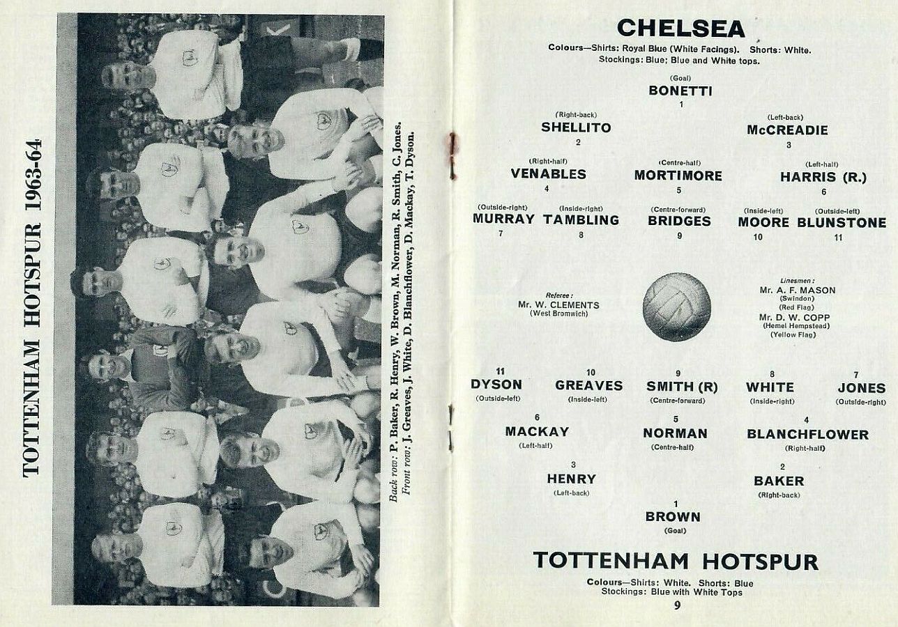 1 John Dunn, 2 Marvin Hinton, 3 Allan Harris, 4 Ron Harris, 5 John Mortimore, 6 Frank Upton, 7 Bert Murray, 8 Bobby Tambling, 9 Barry Bridges, 10 Tommy Harmer, 11 Frank Blunstone |