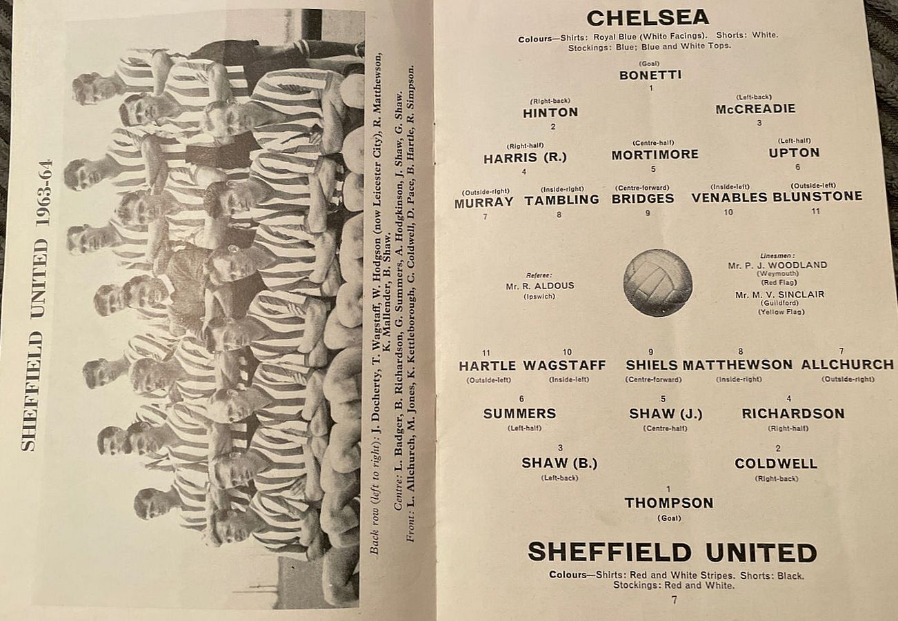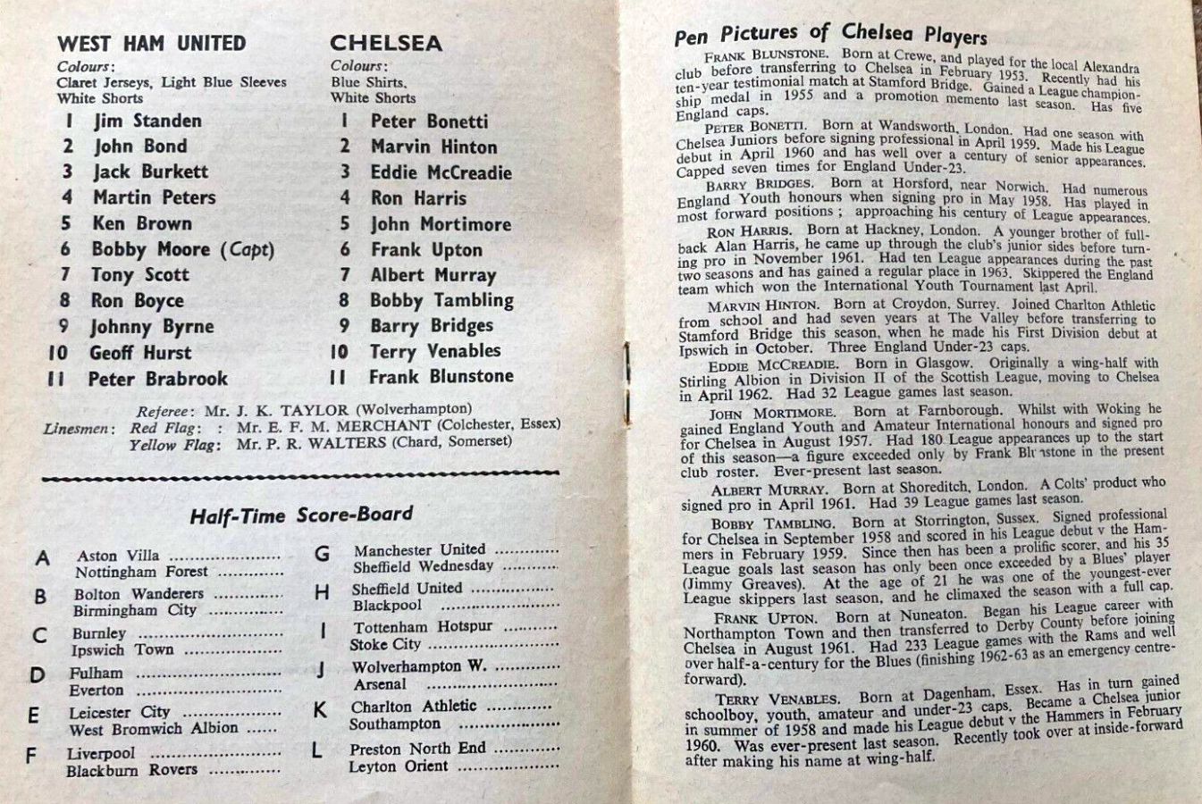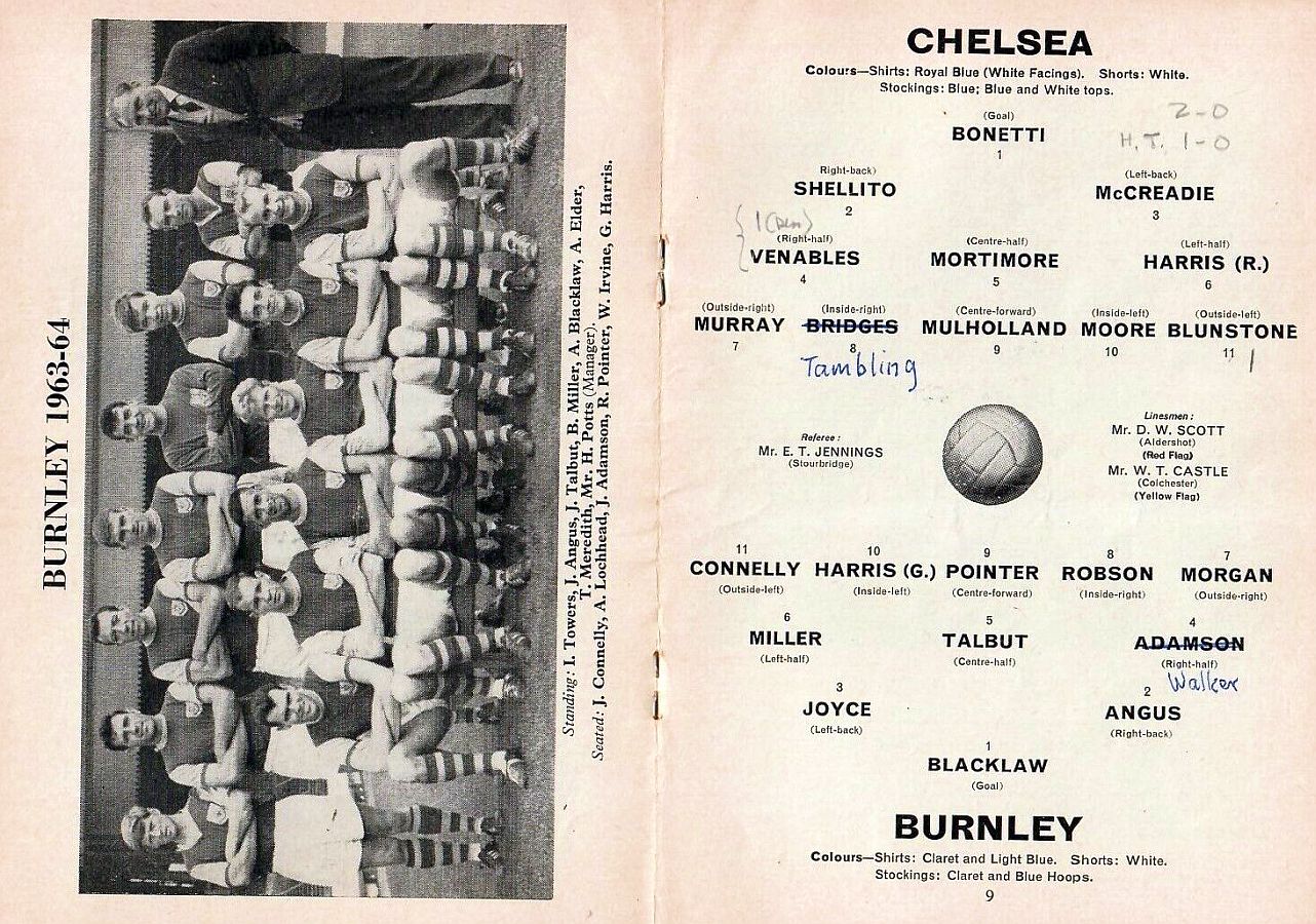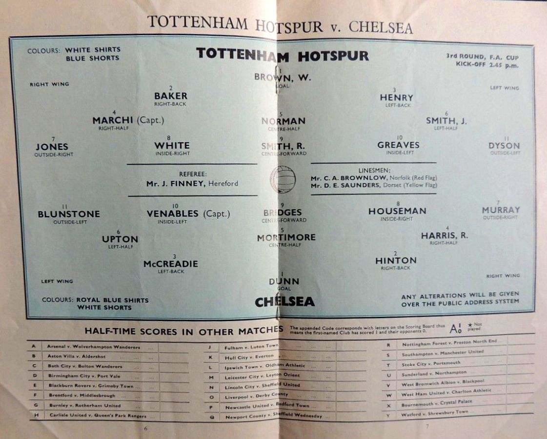 1 John Dunn, 2 Marvin Hinton, 3 Allan Harris, 4 Ron Harris, 5 John Mortimore, 6 Frank Upton, 7 Bert Murray, 8 Bobby Tambling, 9 Barry Bridges, 10 Tommy Harmer, 11 Frank Blunstone |