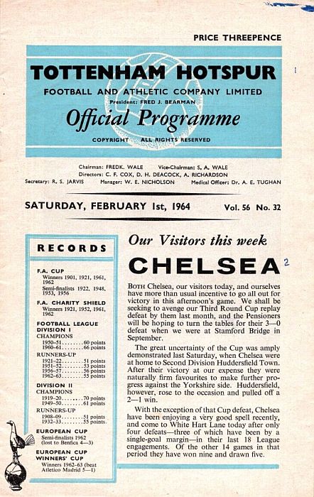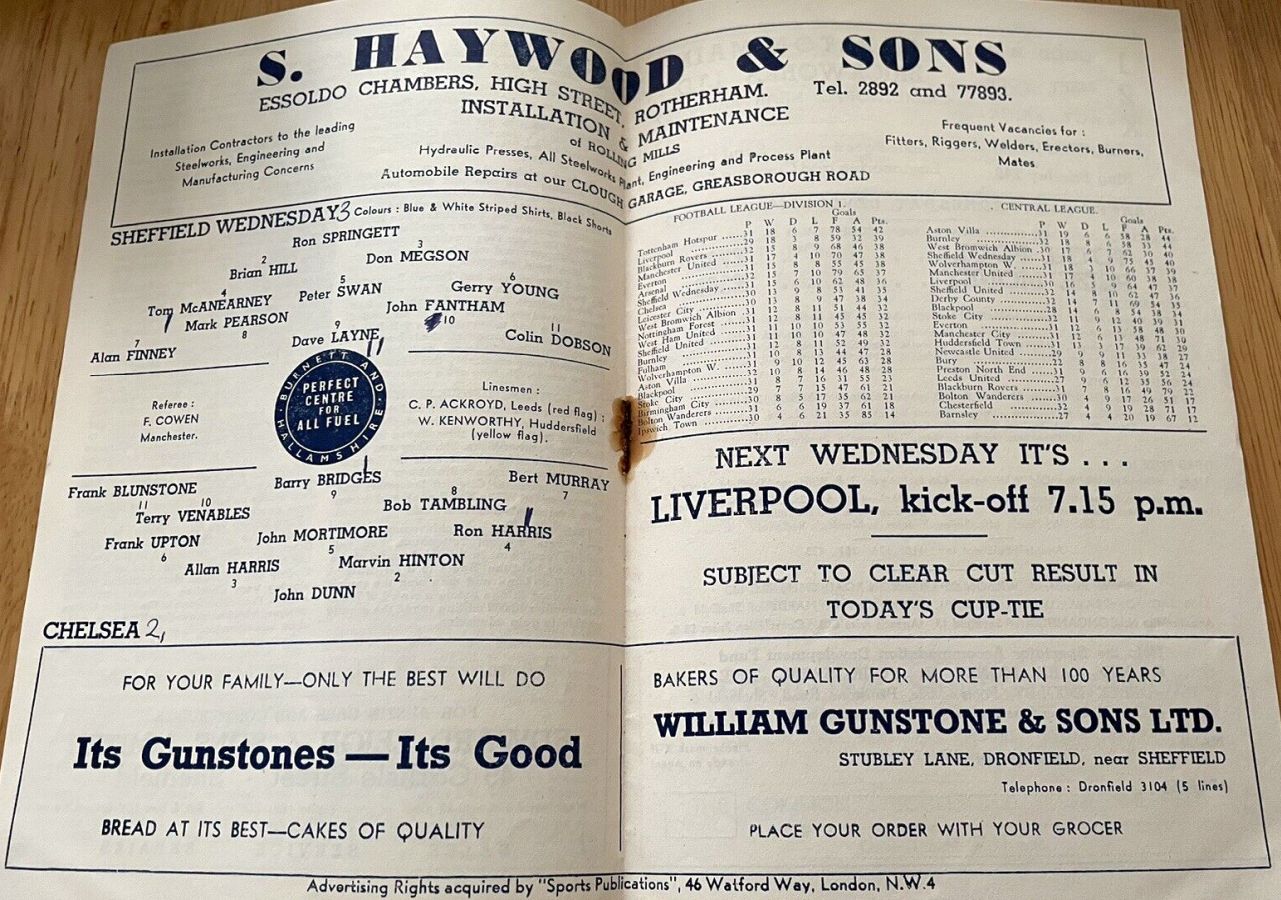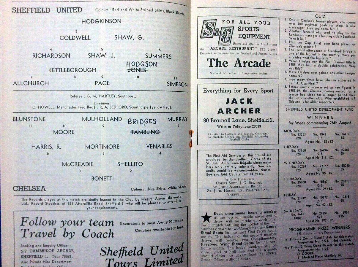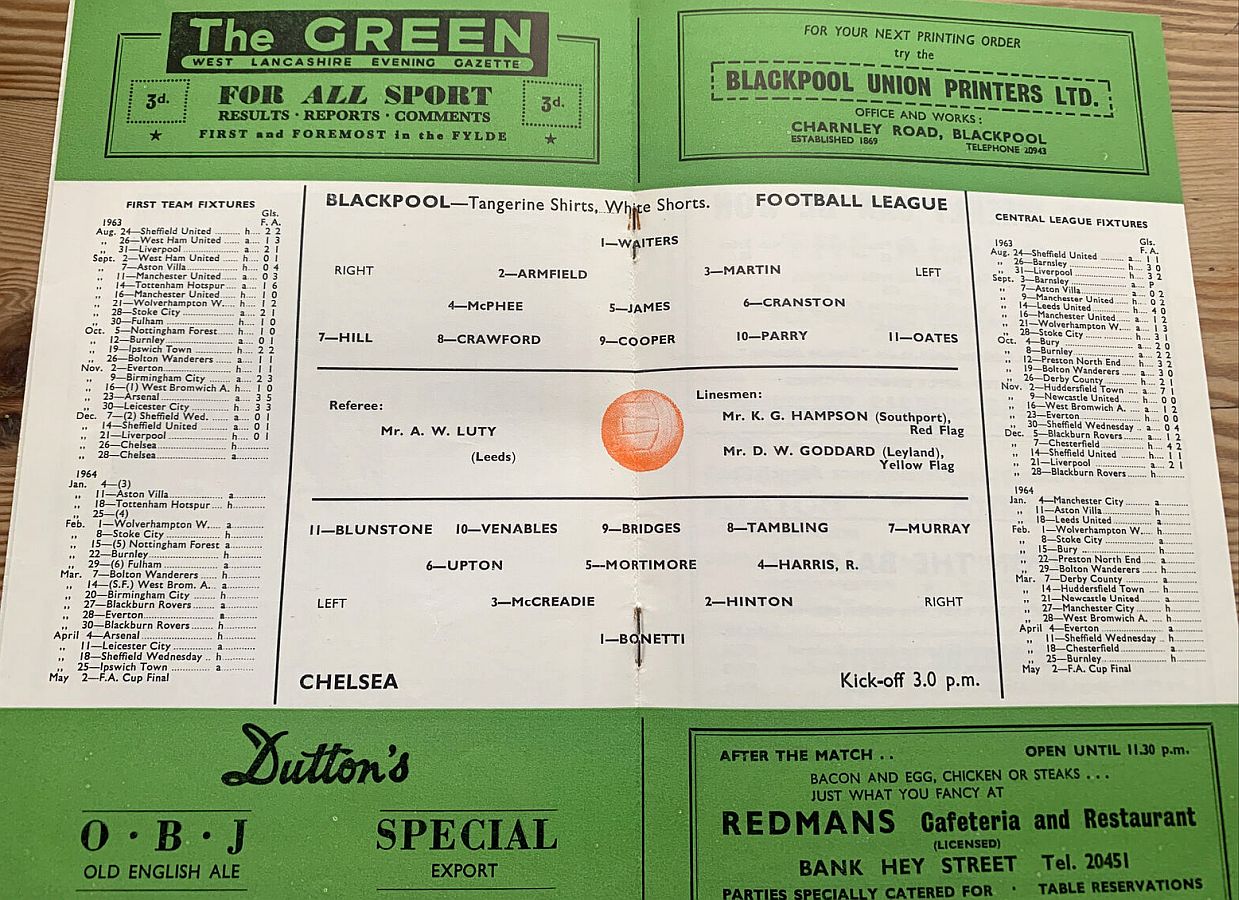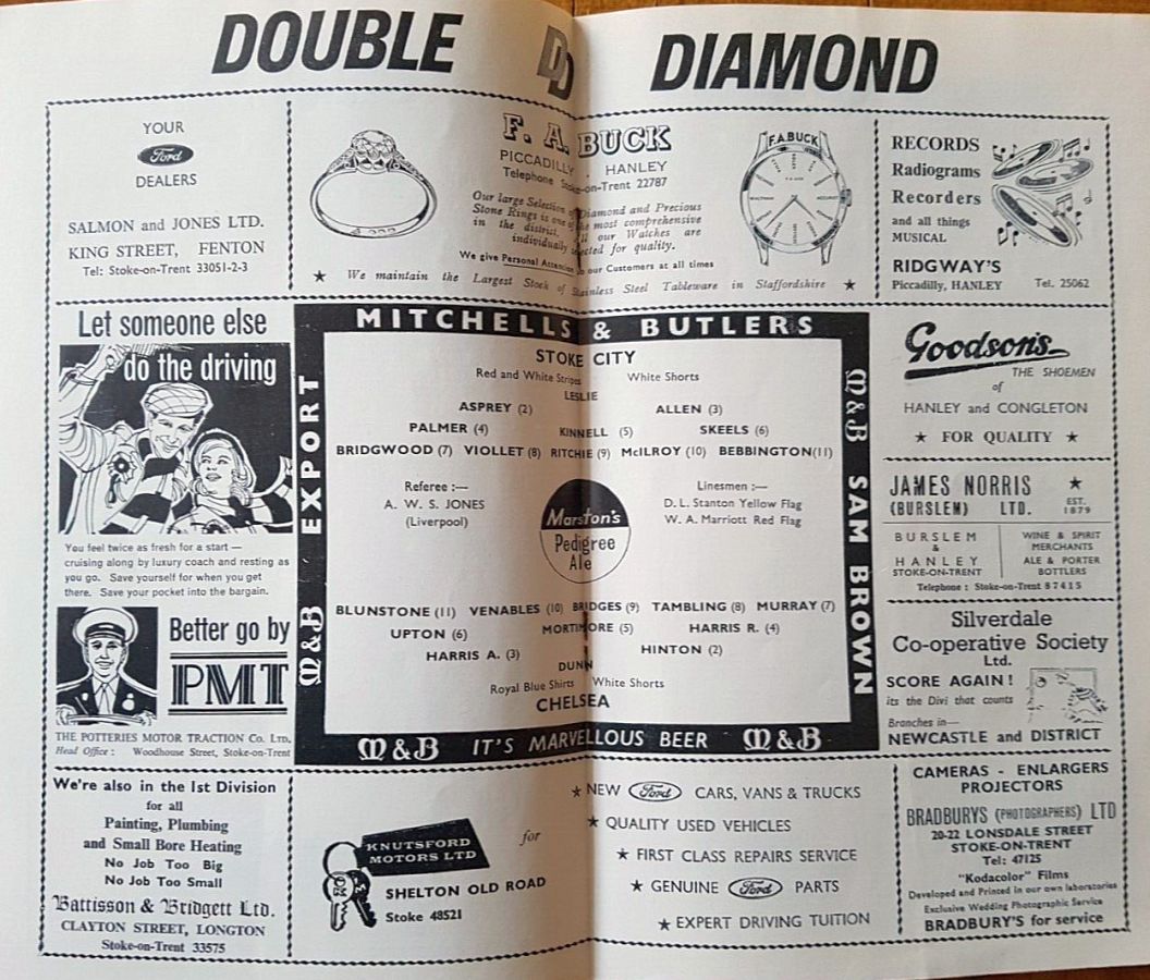 1 John Dunn, 2 Marvin Hinton, 3 Allan Harris, 4 Ron Harris, 5 John Mortimore, 6 Frank Upton, 7 Bert Murray, 8 Bobby Tambling, 9 Barry Bridges, 10 Tommy Harmer, 11 Frank Blunstone |