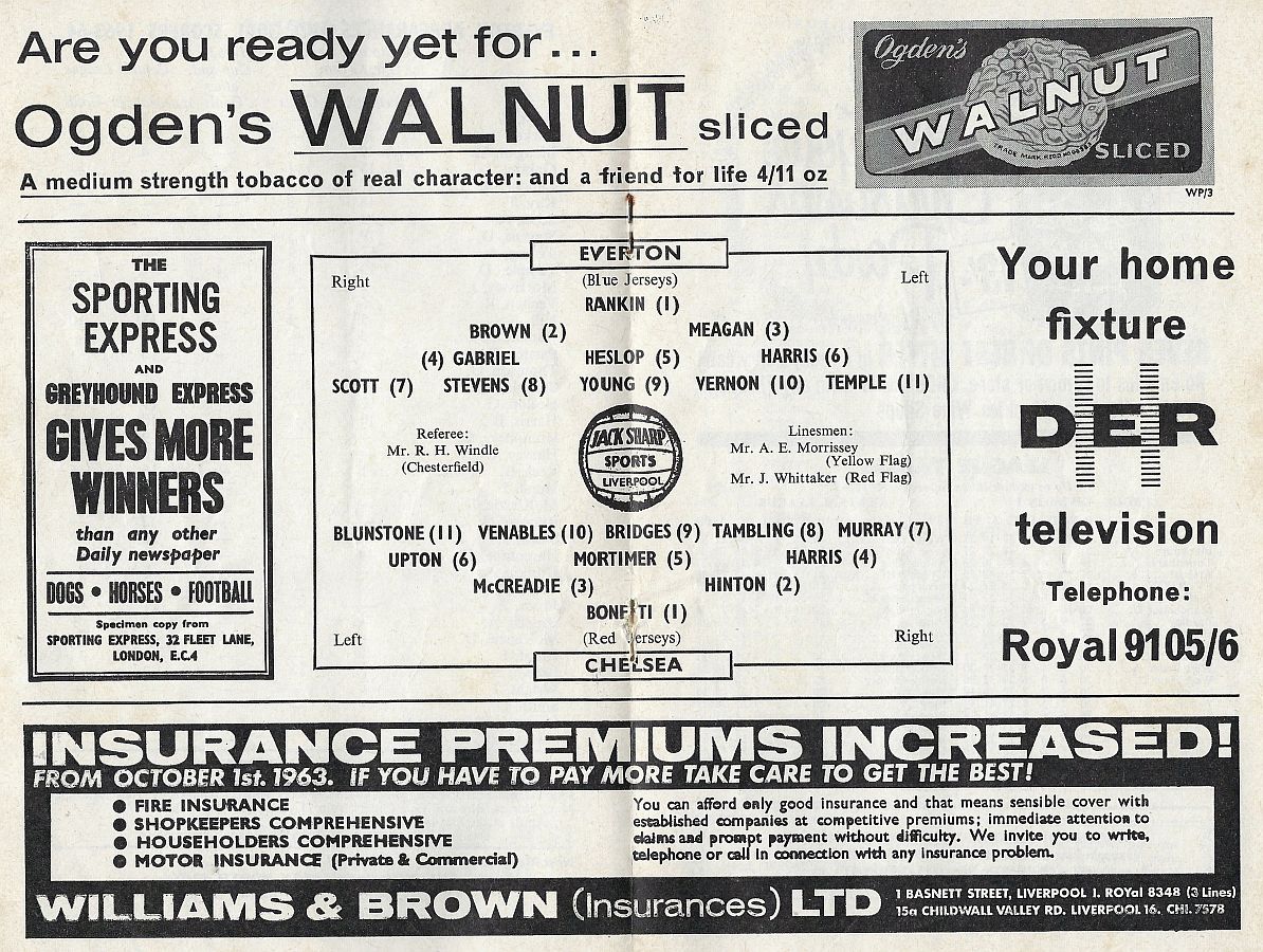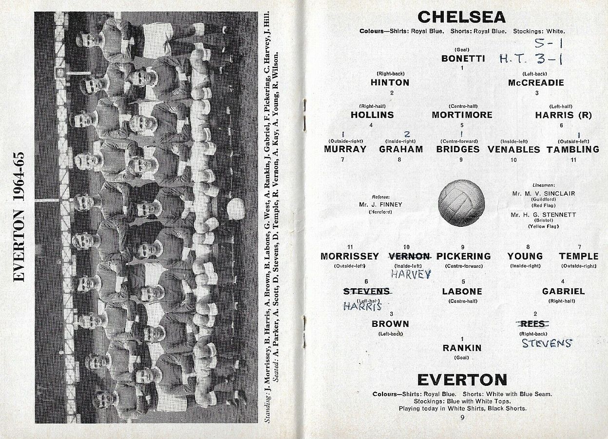 Andy Rankin, Sandy Brown, Mick Meagan, Jimmy Gabriel, Brian Labone, Brian Harris, Alex Scott, Dennis Stevens, Fred Pickering, Roy Vernon, Derek Temple |