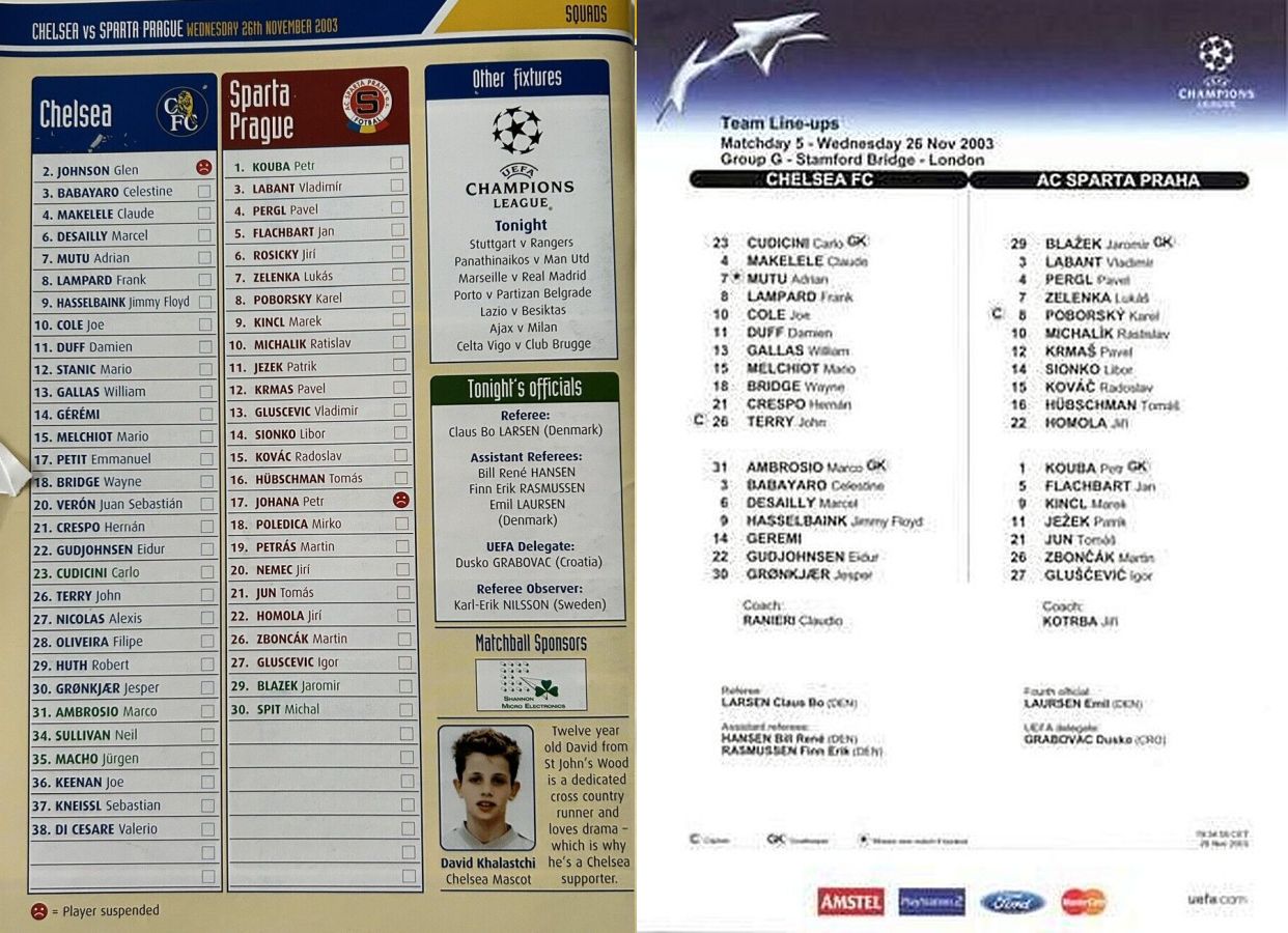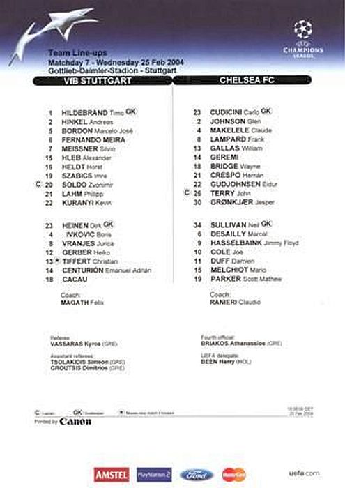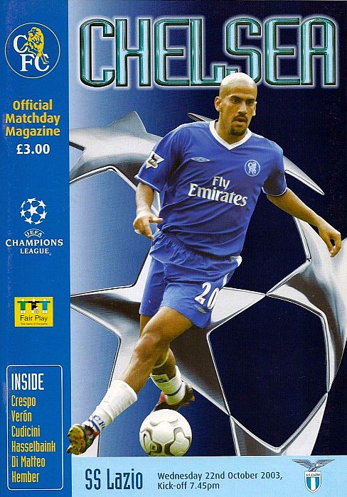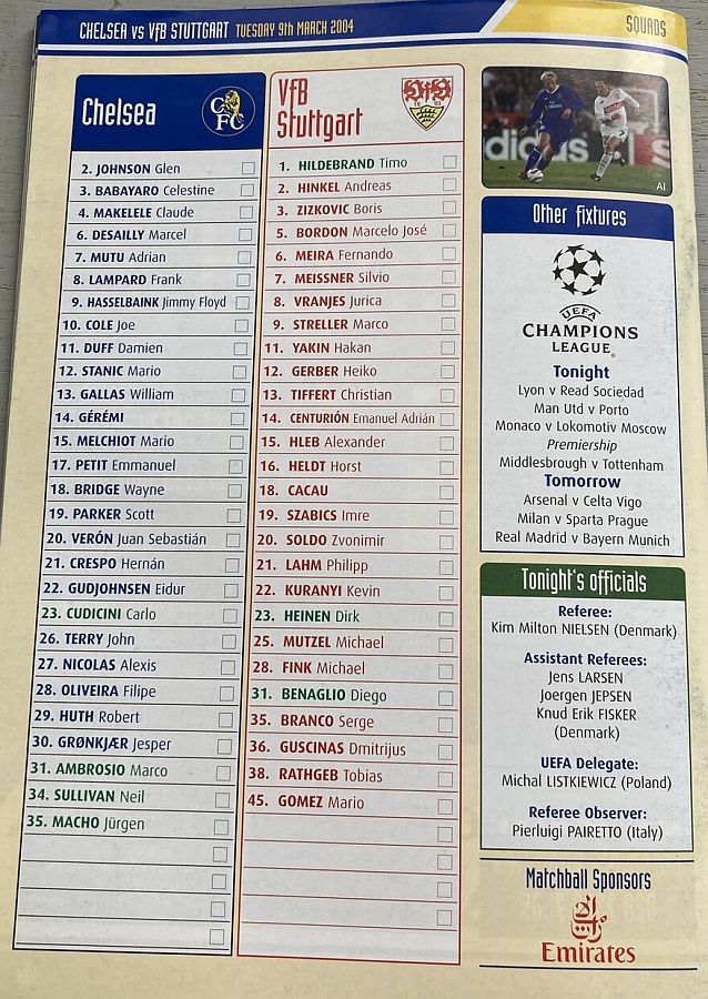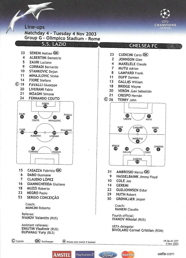 31 Marco Ambrosio, 4 Claude Makelele, 6 Marcel Desailly, 8 Frank Lampard, 15 Mario Melchiot ( 9 Jimmy Floyd Hasselbaink 62), 18 Wayne Bridge, 19 Scott Parker (29 Robert Huth 69), 21 Hernan Crespo, 22 Eidur Gudjohnsen, 26 John Terry, 30 Jesper Gronkjaer (20 Juan Veron 45) |