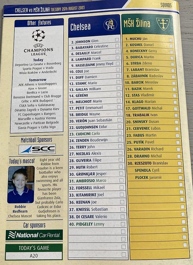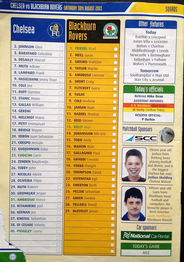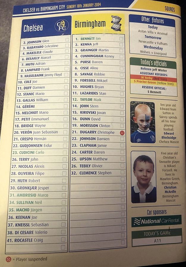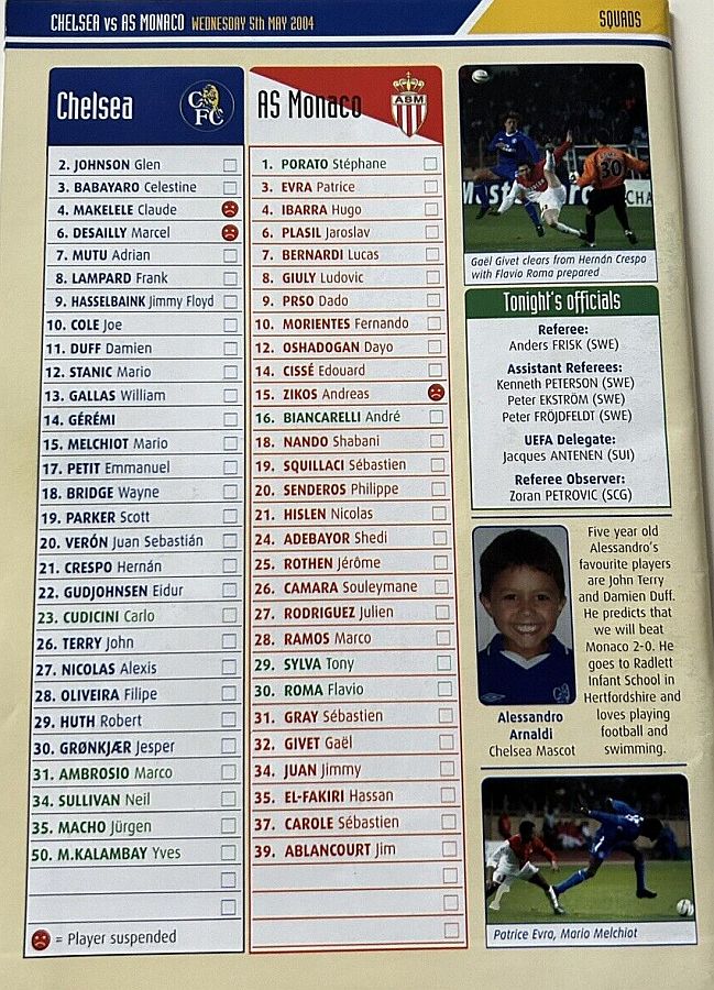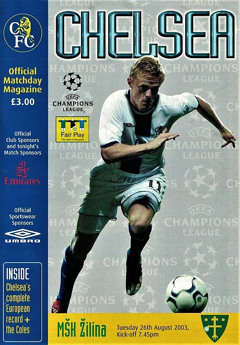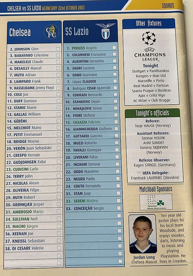 31 Marco Ambrosio, 4 Claude Makelele, 6 Marcel Desailly, 8 Frank Lampard, 15 Mario Melchiot ( 9 Jimmy Floyd Hasselbaink 62), 18 Wayne Bridge, 19 Scott Parker (29 Robert Huth 69), 21 Hernan Crespo, 22 Eidur Gudjohnsen, 26 John Terry, 30 Jesper Gronkjaer (20 Juan Veron 45) |