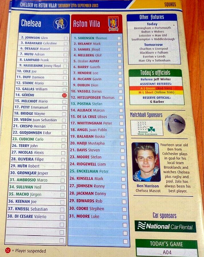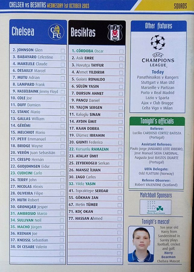 31 Marco Ambrosio, 4 Claude Makelele, 6 Marcel Desailly (29 Robert Huth 71), 8 Frank Lampard, 10 Joe Cole, 14 Geremi, 15 Mario Melchiot, 18 Wayne Bridge, 21 Hernan Crespo ( 9 Jimmy Floyd Hasselbaink 71), 22 Eidur Gudjohnsen, 26 John Terry |