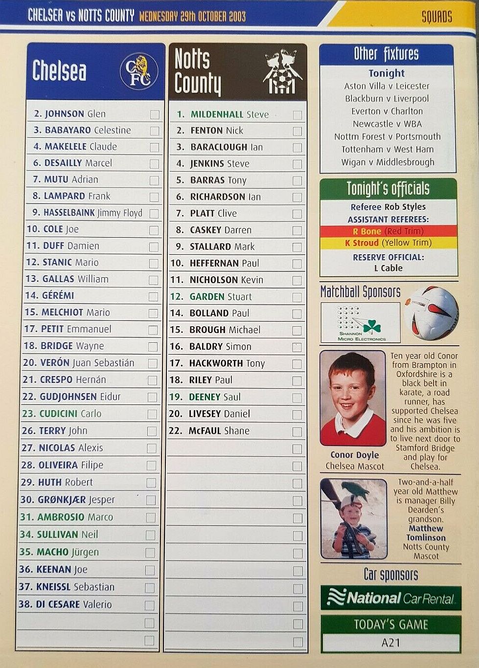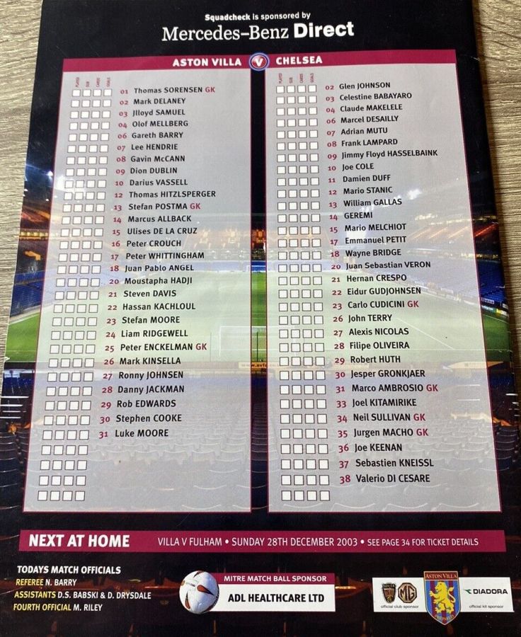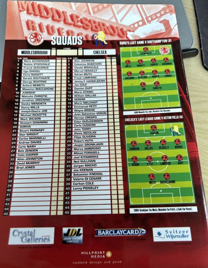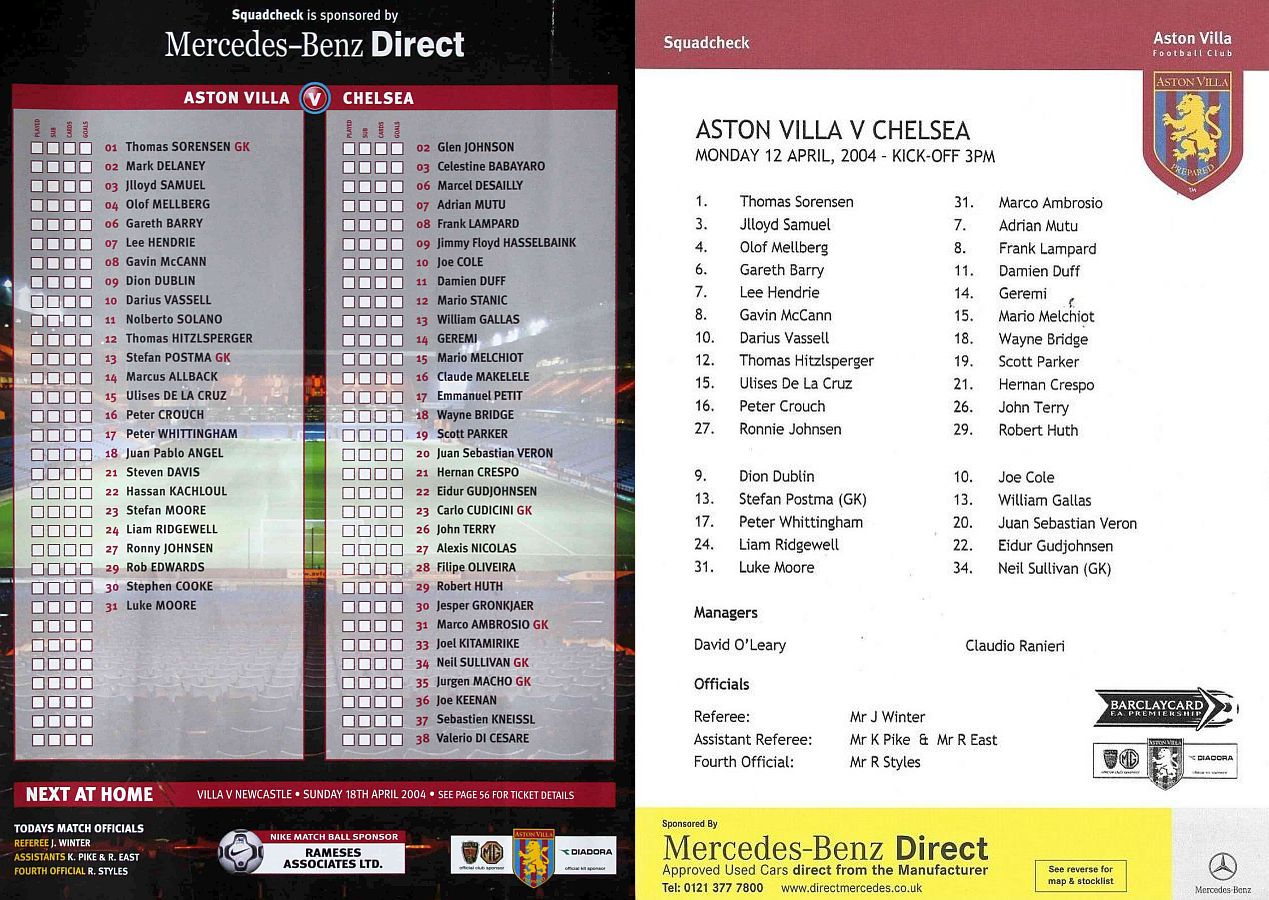 31 Marco Ambrosio, 7 Adrian Mutu (10 Joe Cole 71), 8 Frank Lampard, 11 Damien Duff (30 Jesper Gronkjaer 71), 14 Geremi, 15 Mario Melchiot (13 William Gallas 61), 18 Wayne Bridge, 19 Scott Parker, 21 Hernan Crespo, 26 John Terry, 29 Robert Huth |