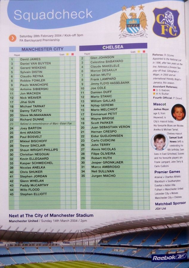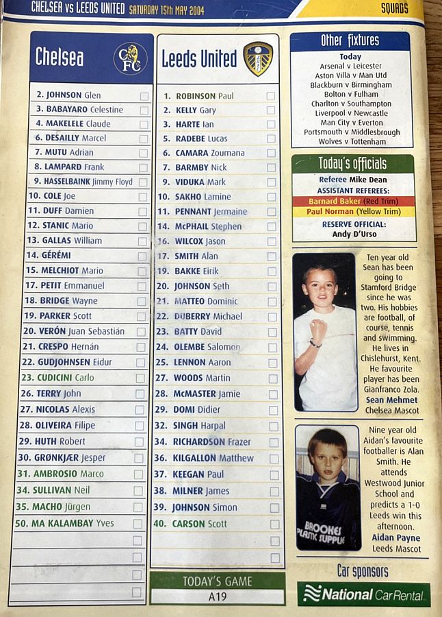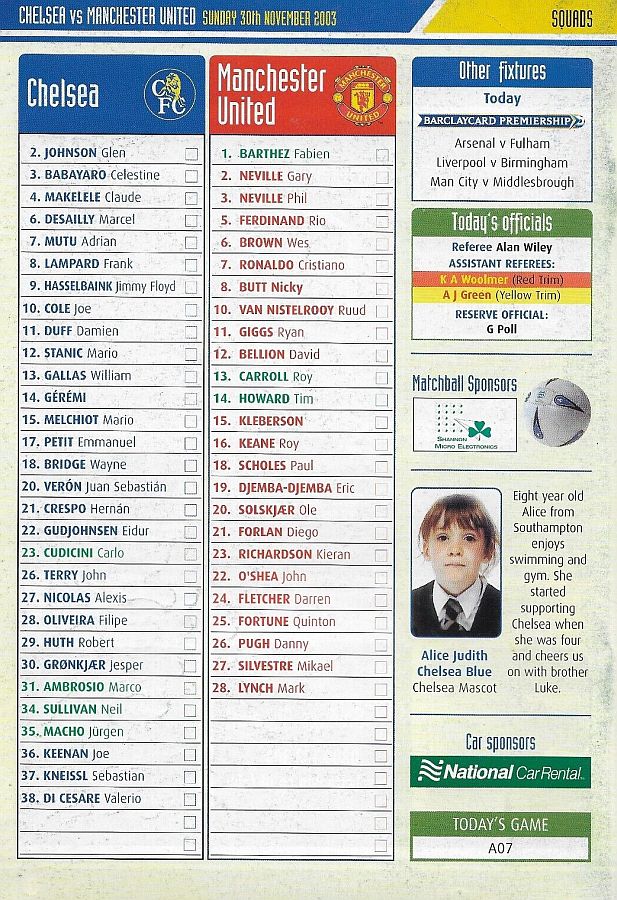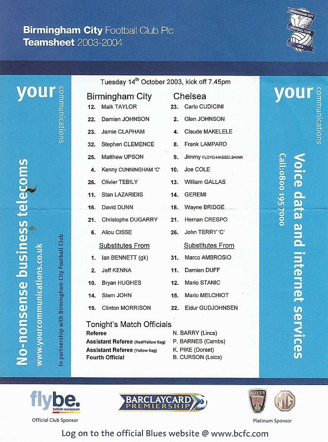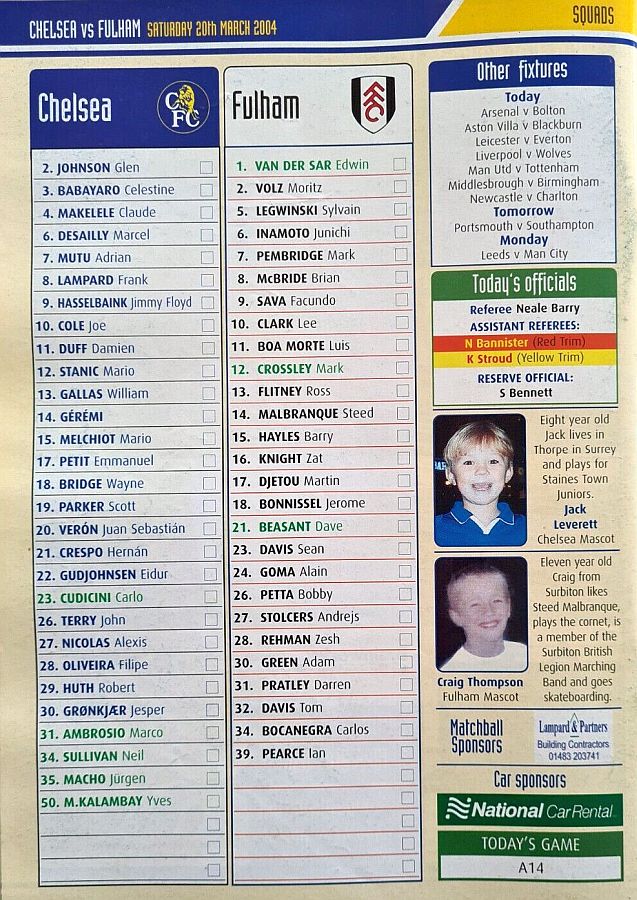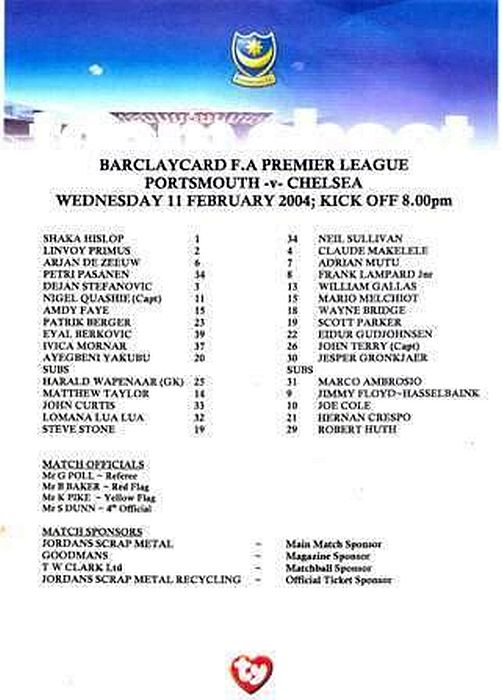 23 Carlo Cudicini, 4 Claude Makelele, 8 Frank Lampard, 10 Joe Cole (19 Scott Parker 78), 14 Geremi, 15 Mario Melchiot ( 2 Glen Johnson 74), 18 Wayne Bridge, 22 Eidur Gudjohnsen, 26 John Terry, 29 Robert Huth, 30 Jesper Gronkjaer ( 3 Celestine Babayaro 83) |