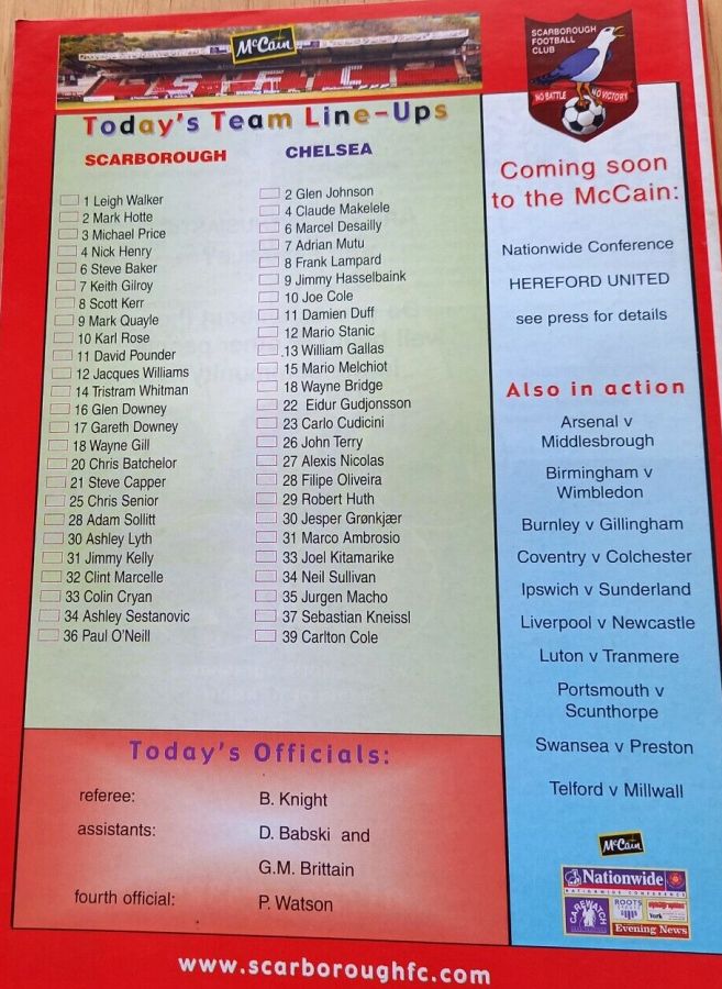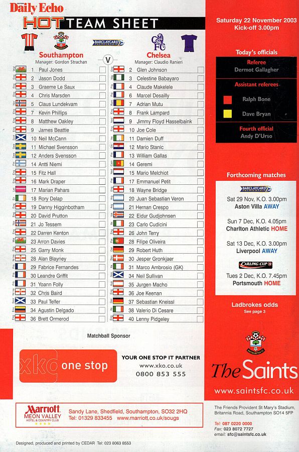23 Carlo Cudicini, 2 Glen Johnson (12 Mario Stanic 82), 4 Claude Makelele, 8 Frank Lampard (27 Alexis Nicolas 90), 10 Joe Cole, 13 William Gallas, 15 Mario Melchiot, 18 Wayne Bridge, 22 Eidur Gudjohnsen, 26 John Terry (29 Robert Huth 85), 30 Jesper Gronkjaer |