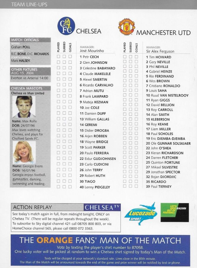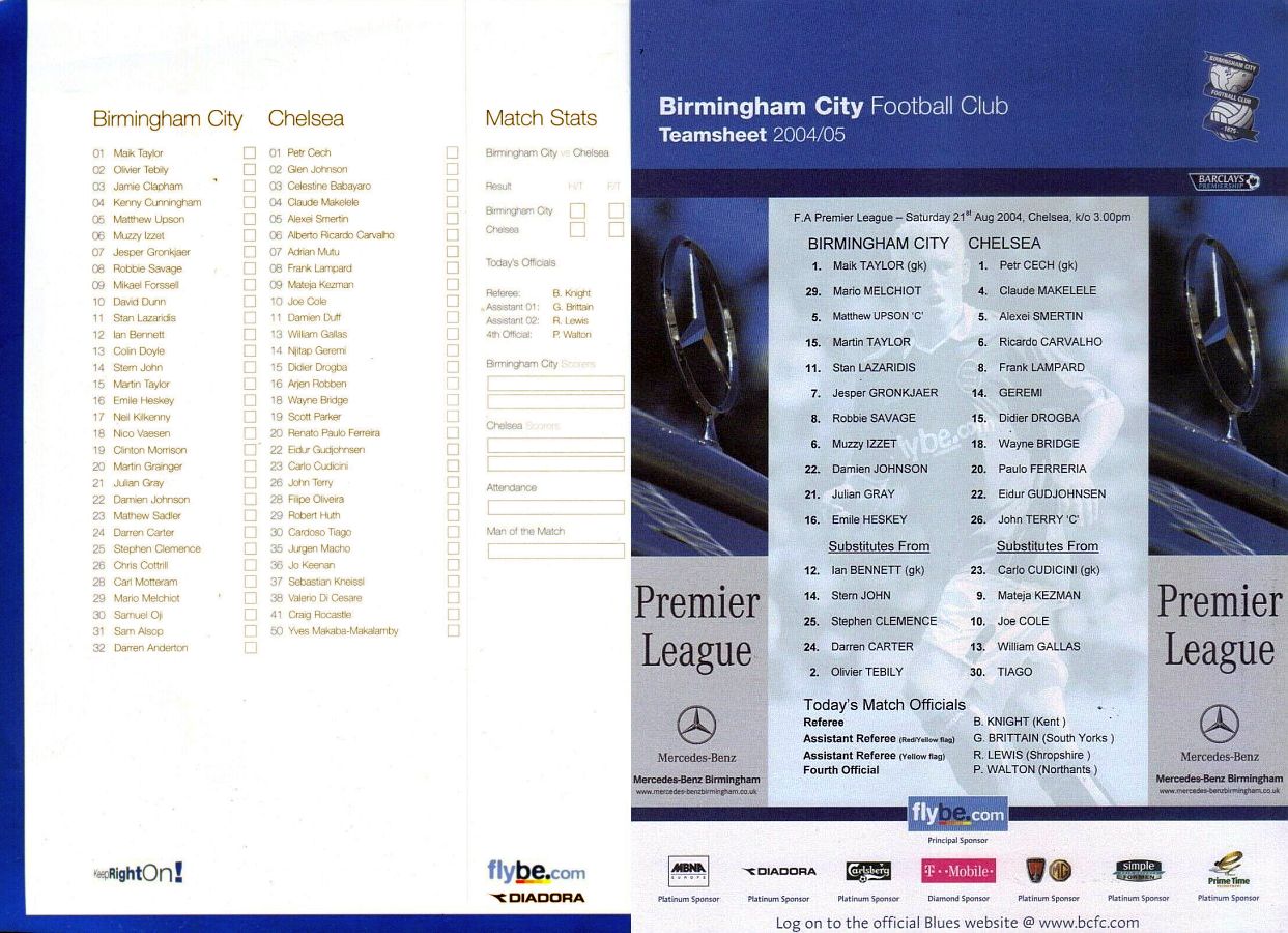 1 Petr Cech, 3 Celestine Babayaro, 4 Claude Makelele, 8 Frank Lampard, 9 Mateja Kezman ( 7 Adrian Mutu 70), 10 Joe Cole (14 Geremi 76), 13 William Gallas, 15 Didier Drogba (22 Eidur Gudjohnsen 75), 20 Paulo Ferreira, 26 John Terry, 30 Tiago |