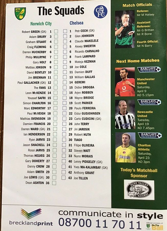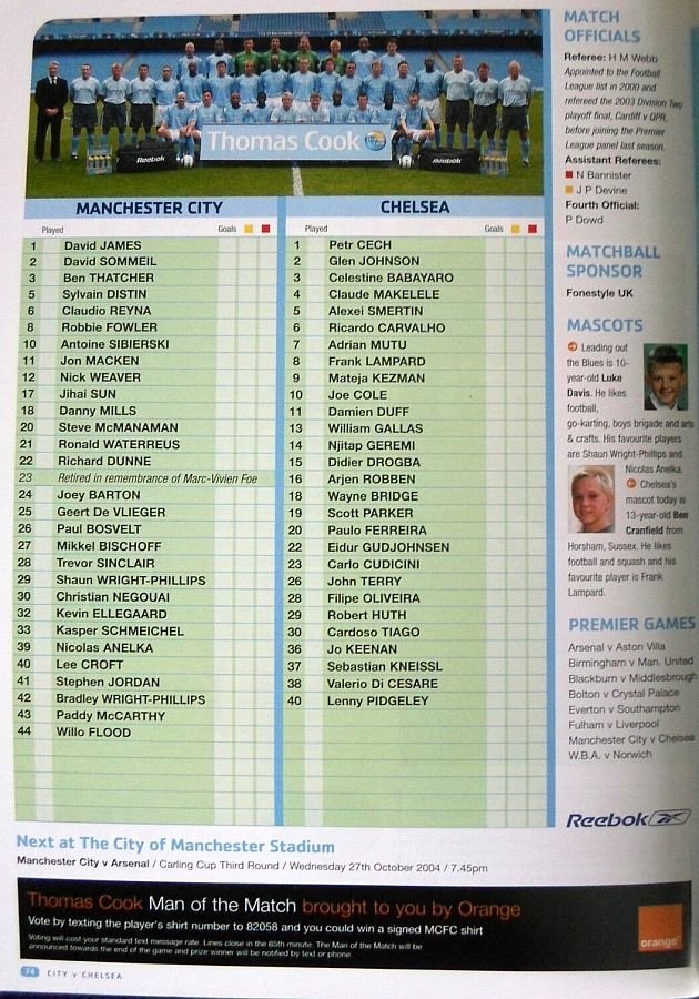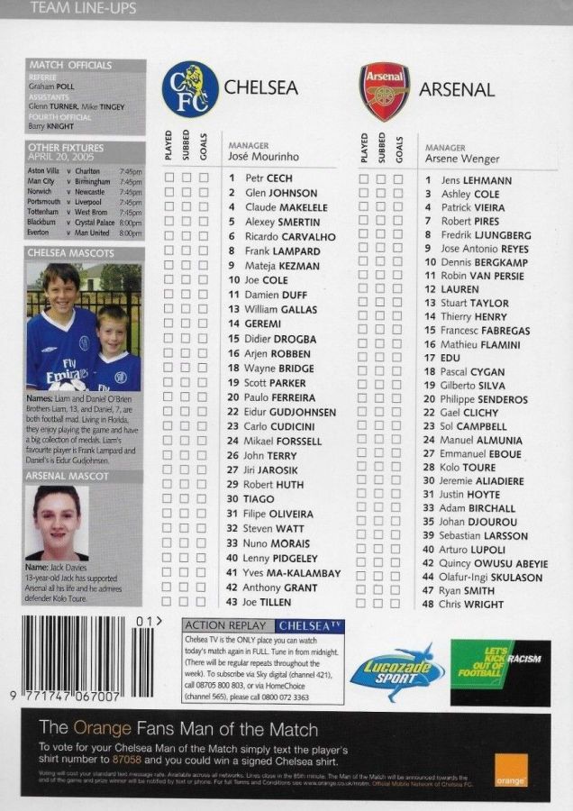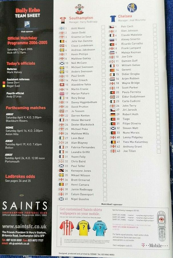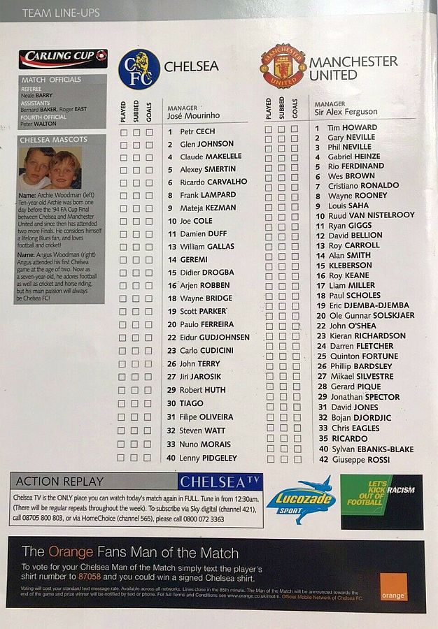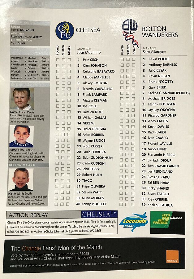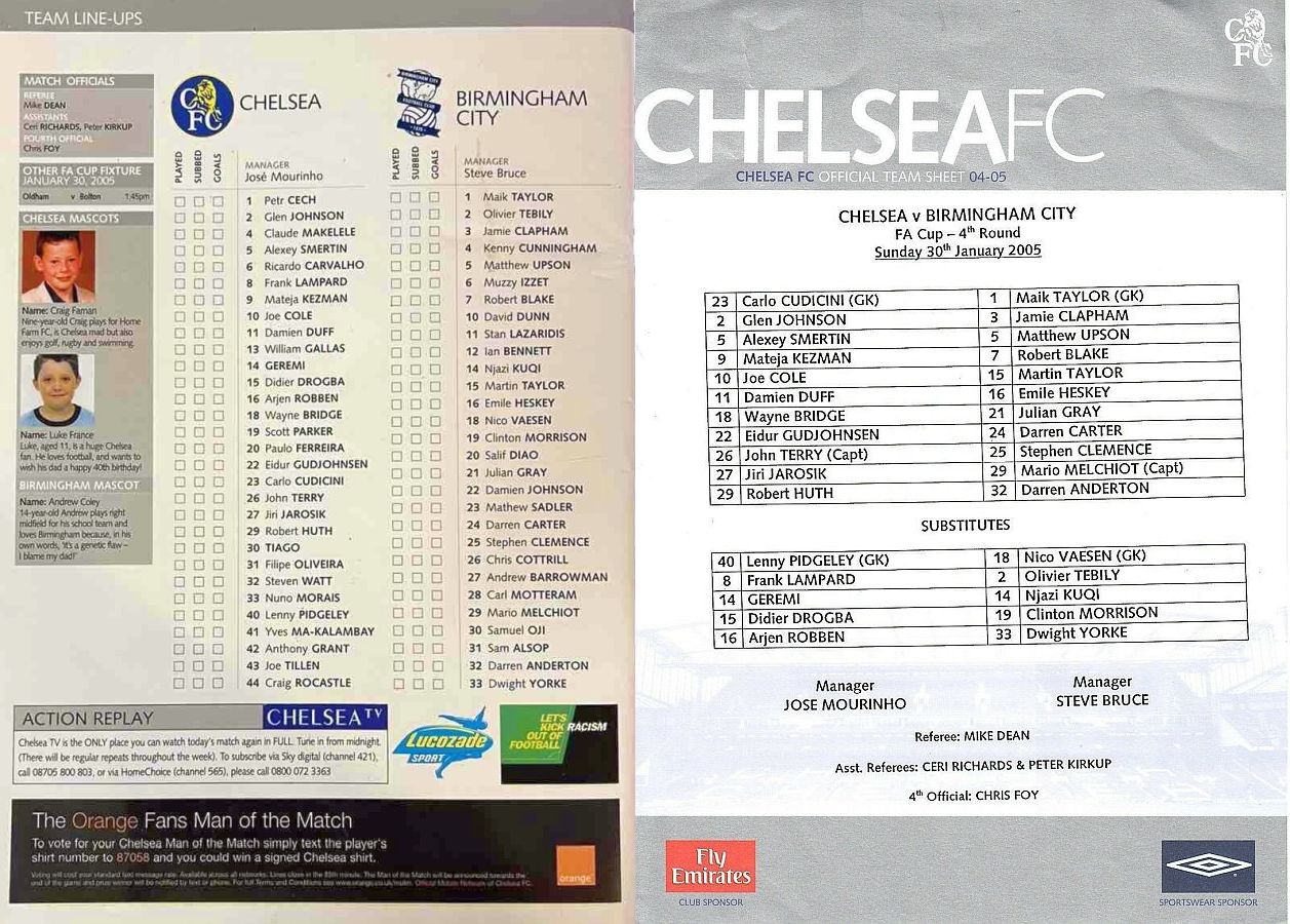 23 Carlo Cudicini, 2 Glen Johnson, 4 Claude Makelele, 6 Ricardo Carvalho, 8 Frank Lampard, 10 Joe Cole (33 Nuno Morais 89), 14 Geremi, 22 Eidur Gudjohnsen (31 Filipe Oliveira 84), 27 Jiri Jarosik (32 Steven Watt 90), 29 Robert Huth, 30 Tiago |