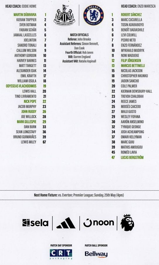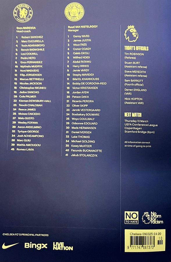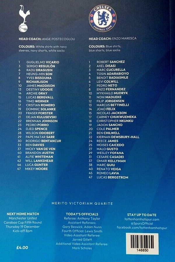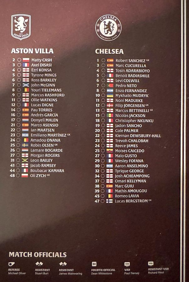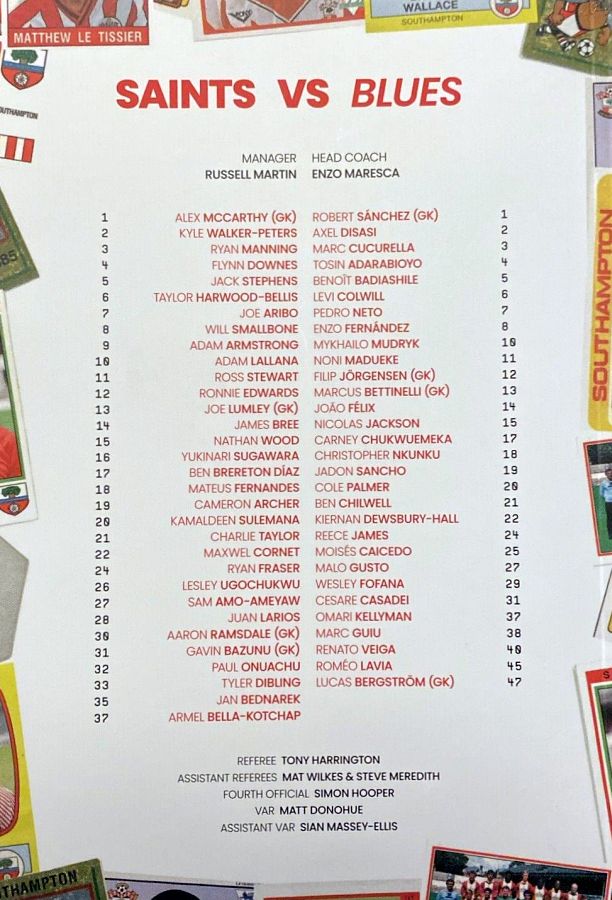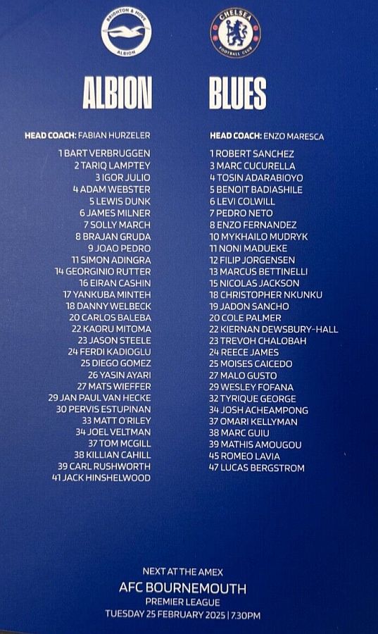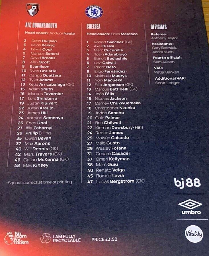 1 Robert Sanchez, 3 Marc Cucurella, 6 Levi Colwill, 7 Pedro Neto, 8 Enzo Fernandez (11 Noni Madueke 82), 9 Liam Delap (15 Nicolas Jackson 64), 10 Cole Palmer (38 Marc Guiu 82), 23 Trevoh Chalobah, 24 Reece James (45 Romeo Lavia 64), 25 Moises Caicedo, 27 Malo Gusto |