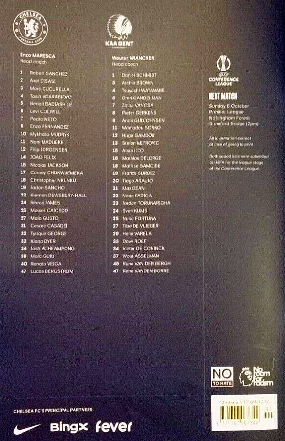 12 Filip Jorgensen, 2 Axel Disasi (27 Malo Gusto 78), 4 Tosin Adarabioyo, 5 Benoit Badiashile, 7 Pedro Neto (11 Noni Madueke 57), 10 Mykhailo Mudryk, 18 Chris Nkunku ( 8 Enzo Fernandez 57), 22 Kiernan Dewsbury-Hall, 25 Moises Caicedo (45 Romeo Lavia 87), 38 Marc Guiu (20 Cole Palmer 57), 40 Renato Veiga |