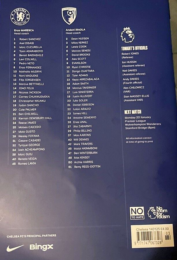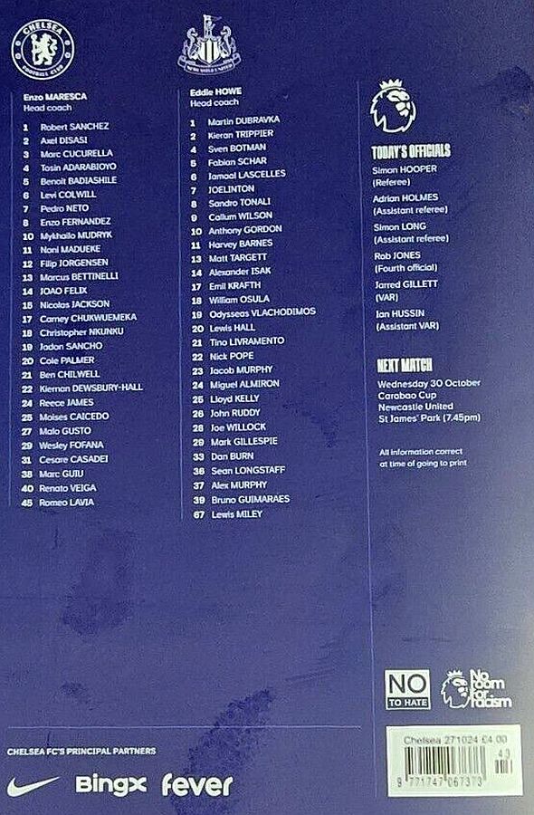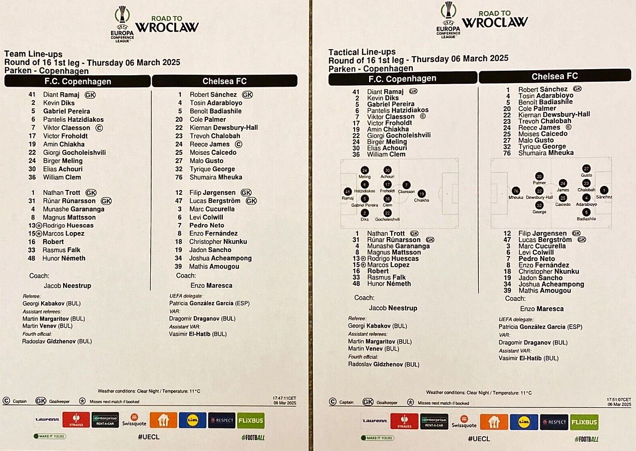 1 Robert Sanchez, 3 Marc Cucurella (40 Renato Veiga 82), 6 Levi Colwill, 8 Enzo Fernandez, 10 Mykhailo Mudryk ( 7 Pedro Neto 46), 11 Noni Madueke, 15 Nicolas Jackson (14 Joao Felix 68), 20 Cole Palmer (18 Chris Nkunku 82), 25 Moises Caicedo (22 Kiernan Dewsbury-Hall 76), 27 Malo Gusto, 29 Wesley Fofana |