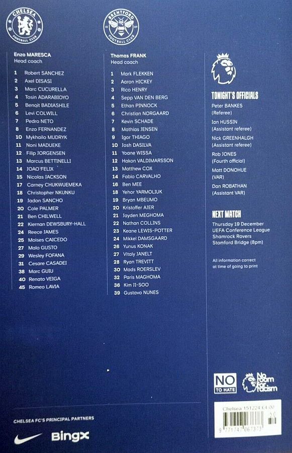 1 Robert Sanchez, 3 Marc Cucurella, 6 Levi Colwill, 7 Pedro Neto (18 Chris Nkunku 78), 8 Enzo Fernandez (17 Andrey Santos 61), 10 Cole Palmer, 23 Trevoh Chalobah, 24 Reece James (22 Kiernan Dewsbury-Hall 77), 25 Moises Caicedo, 27 Malo Gusto, 20 Joao Pedro ( 9 Liam Delap 67) |