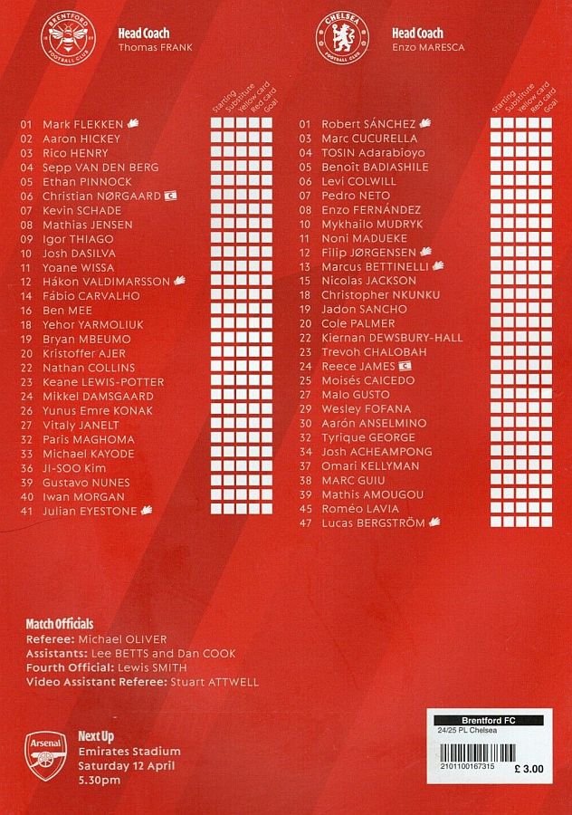 12 Filip Jorgensen, 5 Benoit Badiashile, 17 Andrey Santos, 19 Mamadou Sarr, 22 Kiernan Dewsbury-Hall, 23 Trevoh Chalobah, 30 Aaron Anselmino, 34 Josh Acheampong, 38 Marc Guiu |